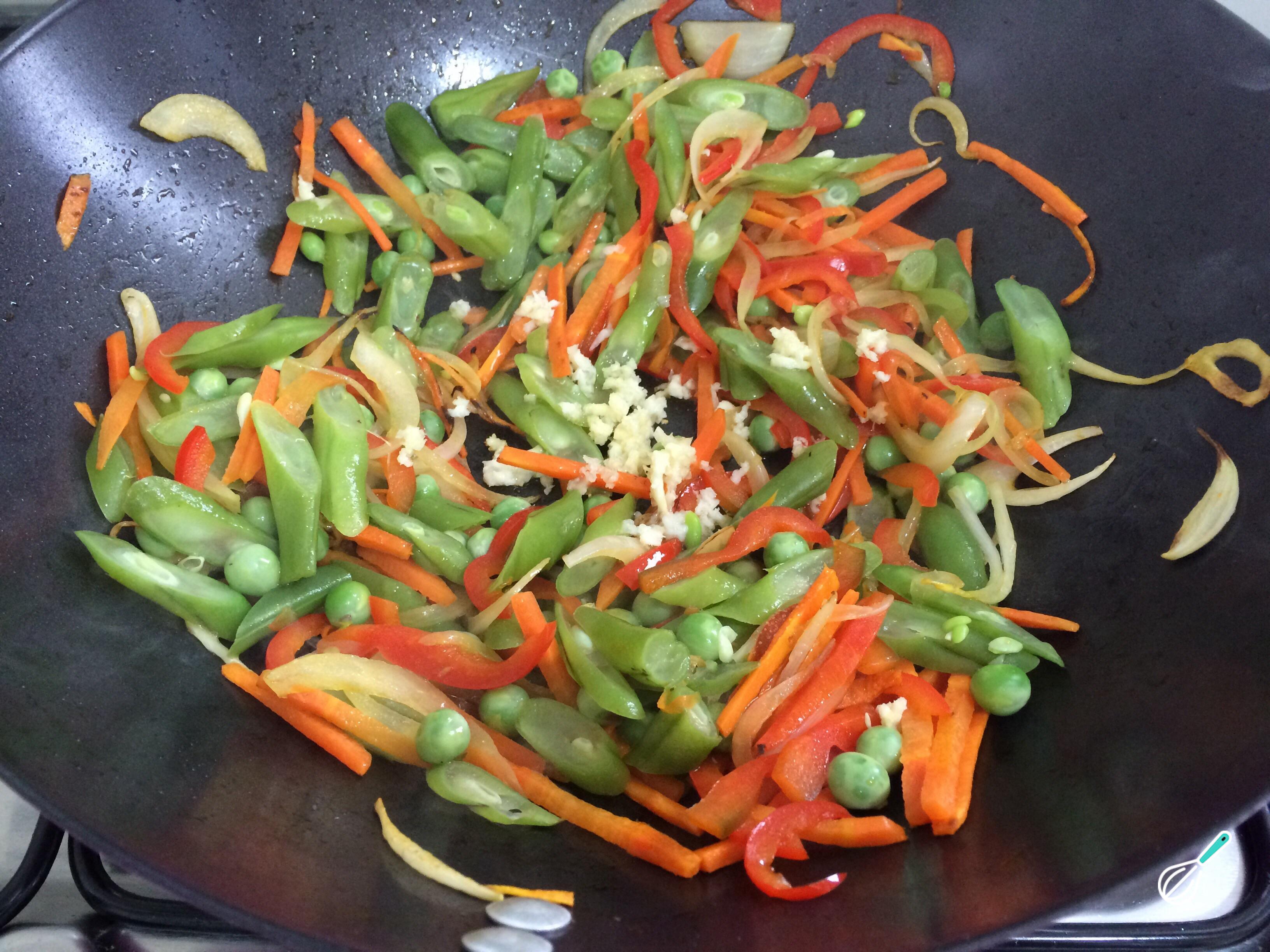 Acrescente a vagem, as ervilhas e os alhos finamente picados, misture tudo e salteie por mais 5 minutos em fogo alto. Tempere a gosto com sal e pimenta, e retire para um prato.