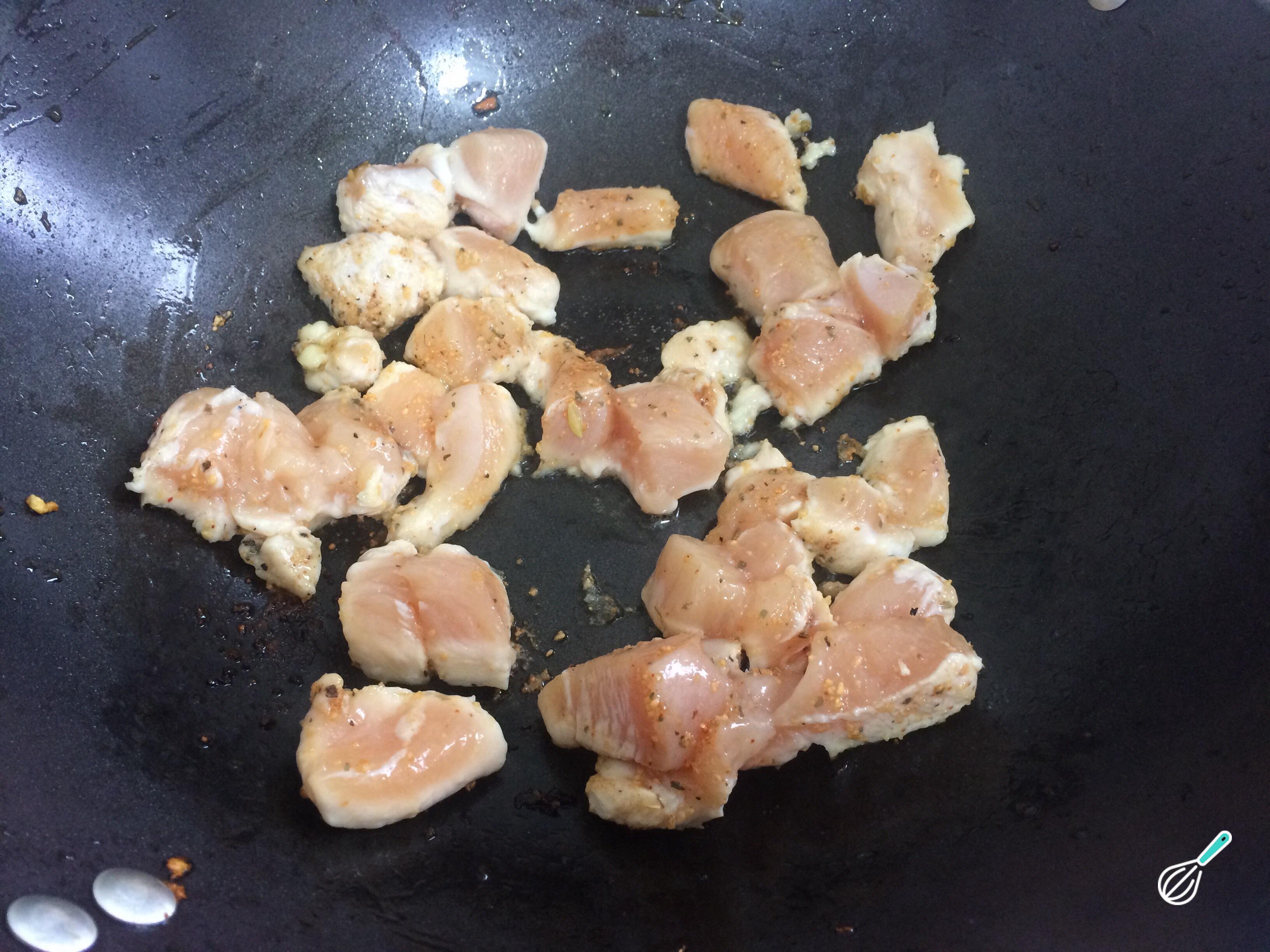 Em seguida cozinhe o frango na mesma frigideira, e temperado com o tempero de frango, sal e pimenta a gosto.