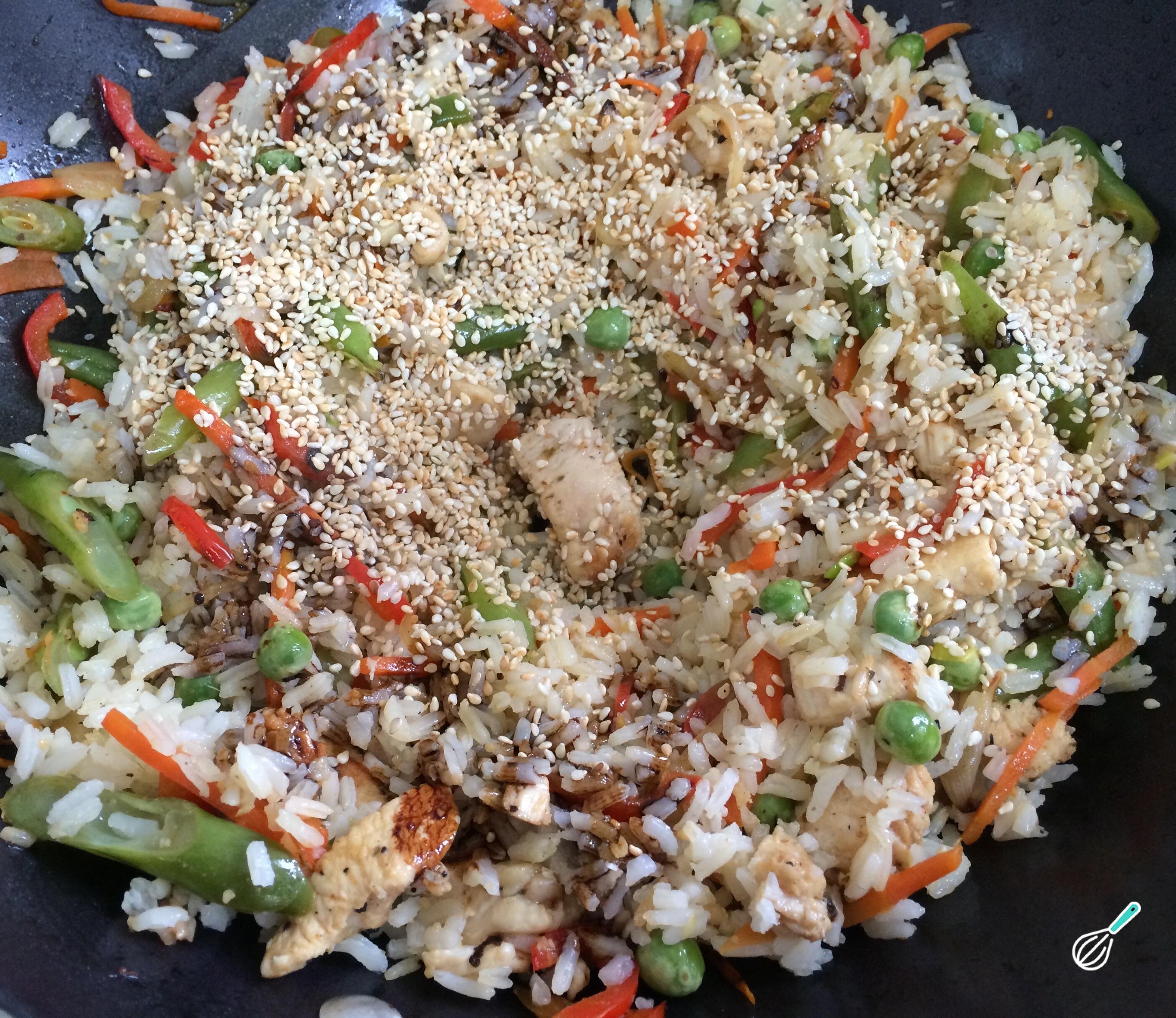Quando o frango estiver pronto, volte a adicionar os legumes, junto com o arroz, o shoyu e as sementes de gergelim. Misture todos estes ingredientes, cozinhe por mais 10 minutos e, se necessário, acerte o sabor com sal e pimenta.