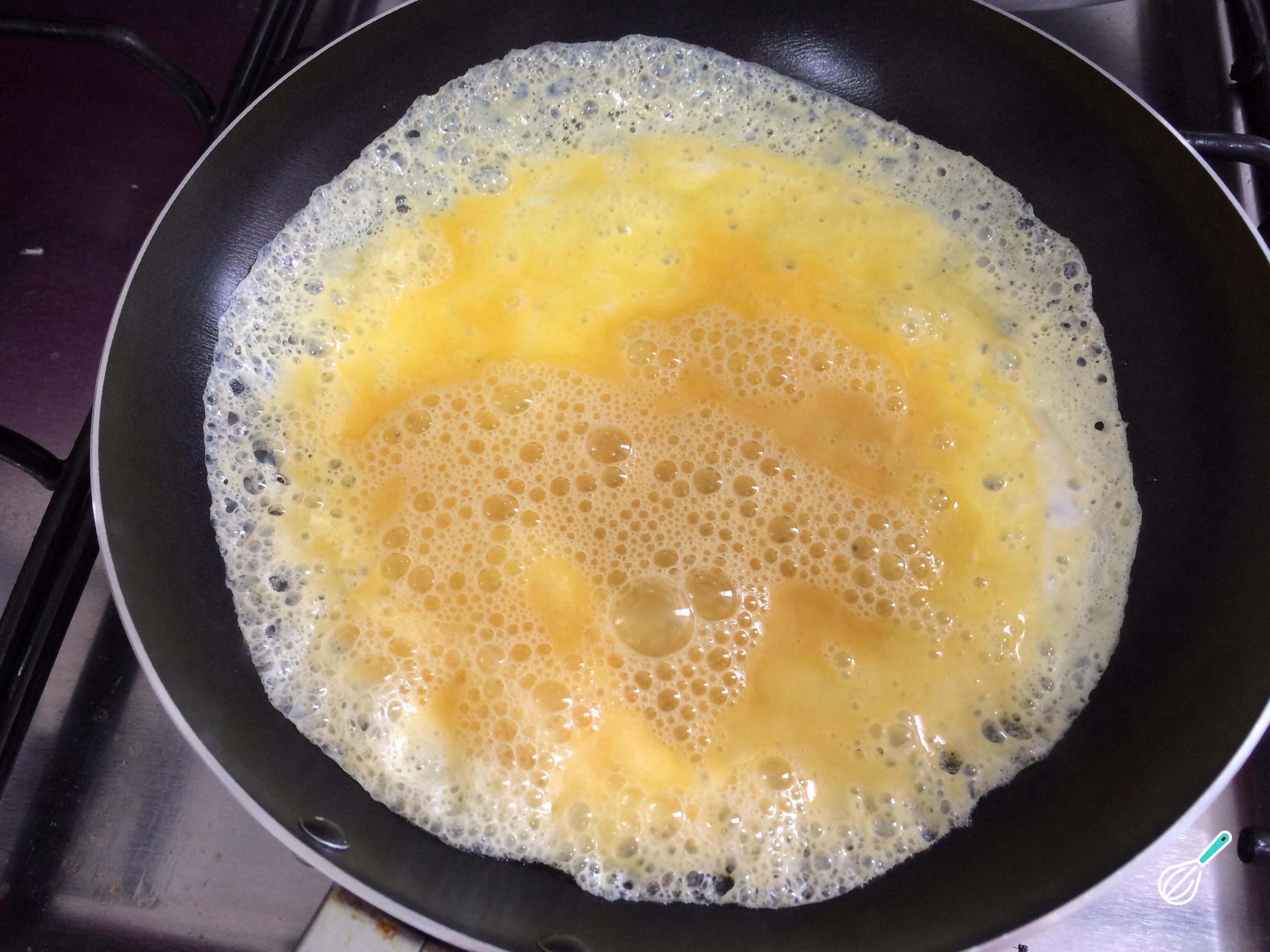 Enquanto isso, e para finalizar esta receita, bata os ovos com um pouco de sal e pimenta, e cozinhe porções em uma frigideira, de forma a obter omeletes finas. Quando estiverem prontas, corte em tiras e misture com os ingredientes do passo anterior.