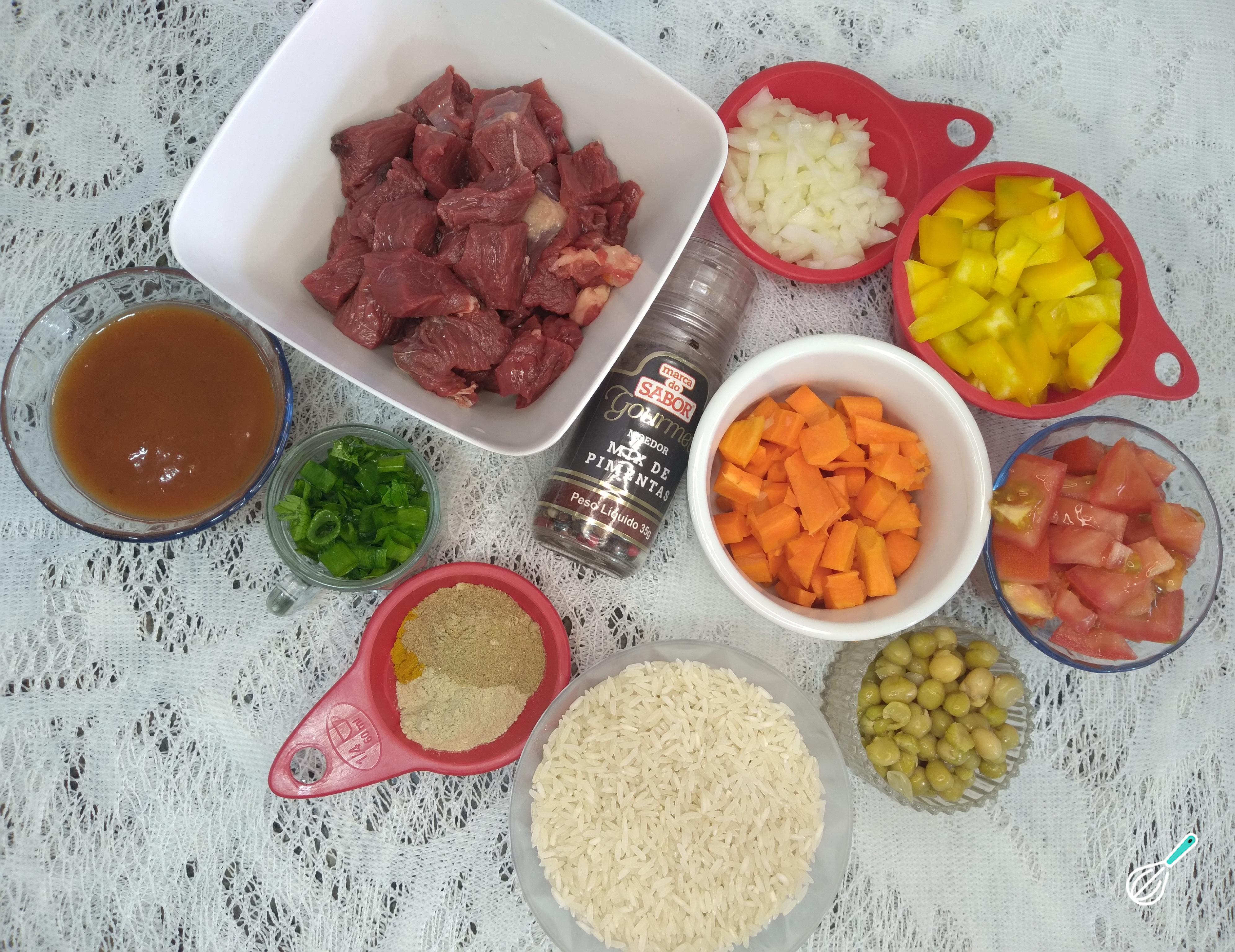 Comece separando os ingredientes para o preparo do arroz jollof. Separe a carne e corte em cubos pequenos. Corte a cebola e o tomate em cubos pequenos. Escorra a água da ervilha, corte a cenoura em quadrados pequenos e finos. Separe os temperos para serem usados na receita e corte o pimentão em cubos ou tiras.