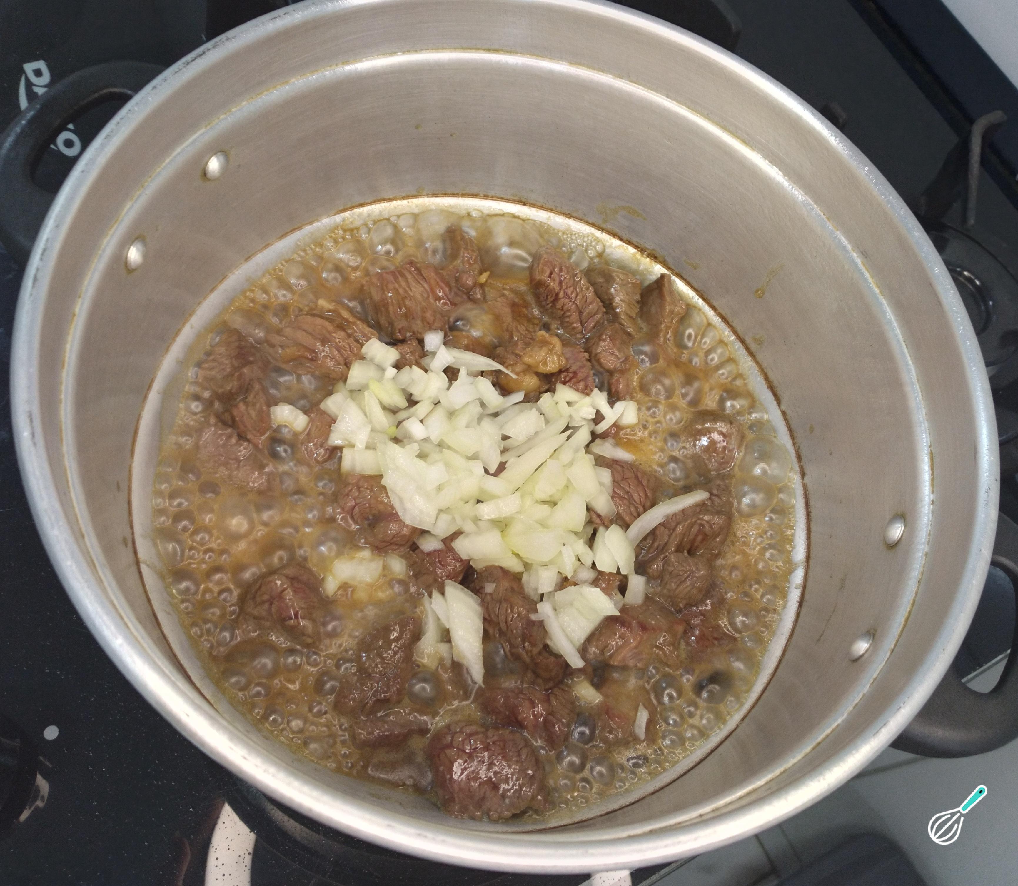 Feito isso, em uma panela coloque um pouco de óleo e acrescente a alcatra picada para selar. Acrescente sal e pimenta a gostos. Deixe que sele dos dois lados e em seguida, acrescente a cebola branca para refogar. Deixe que solte líquidos e mexa bem.