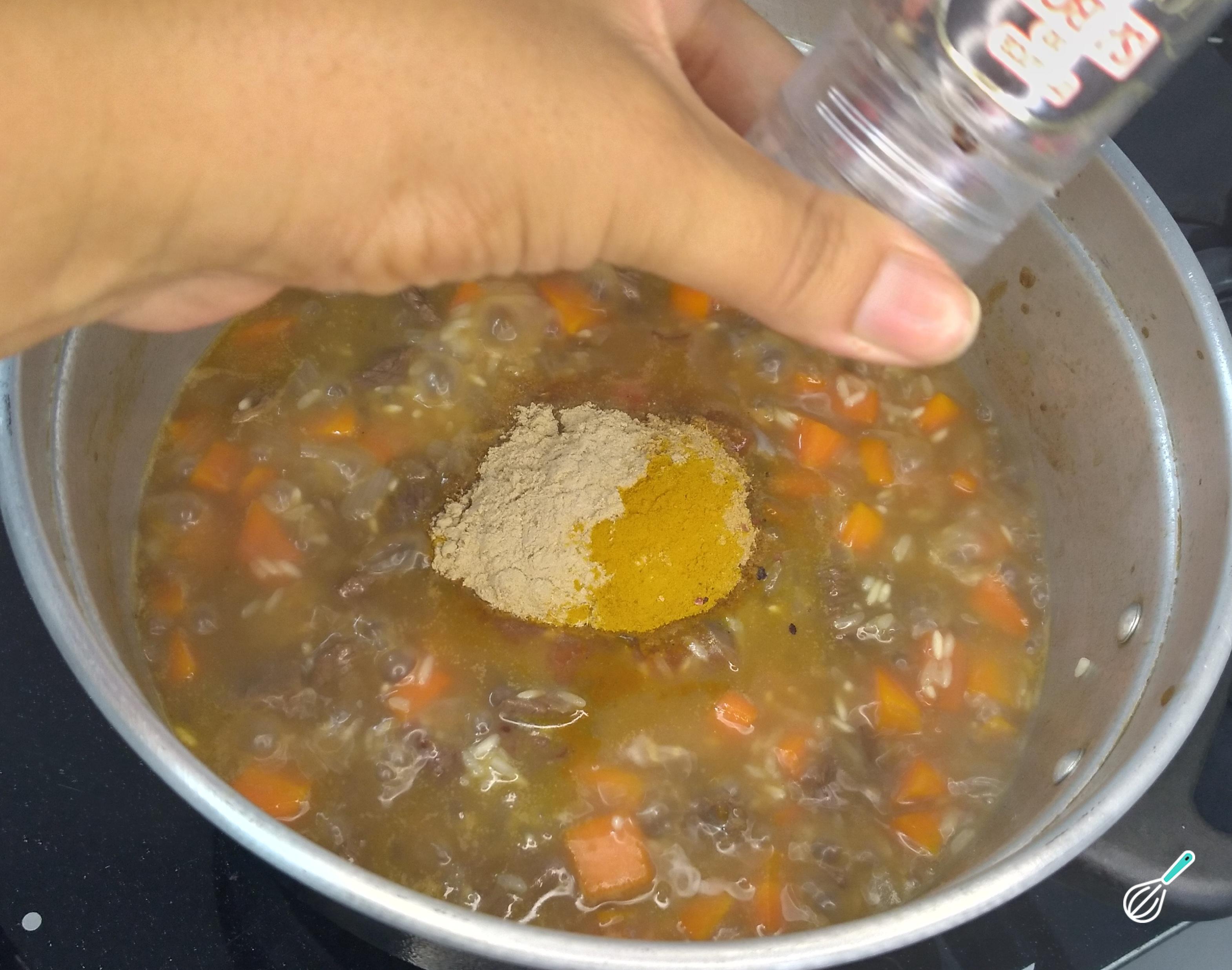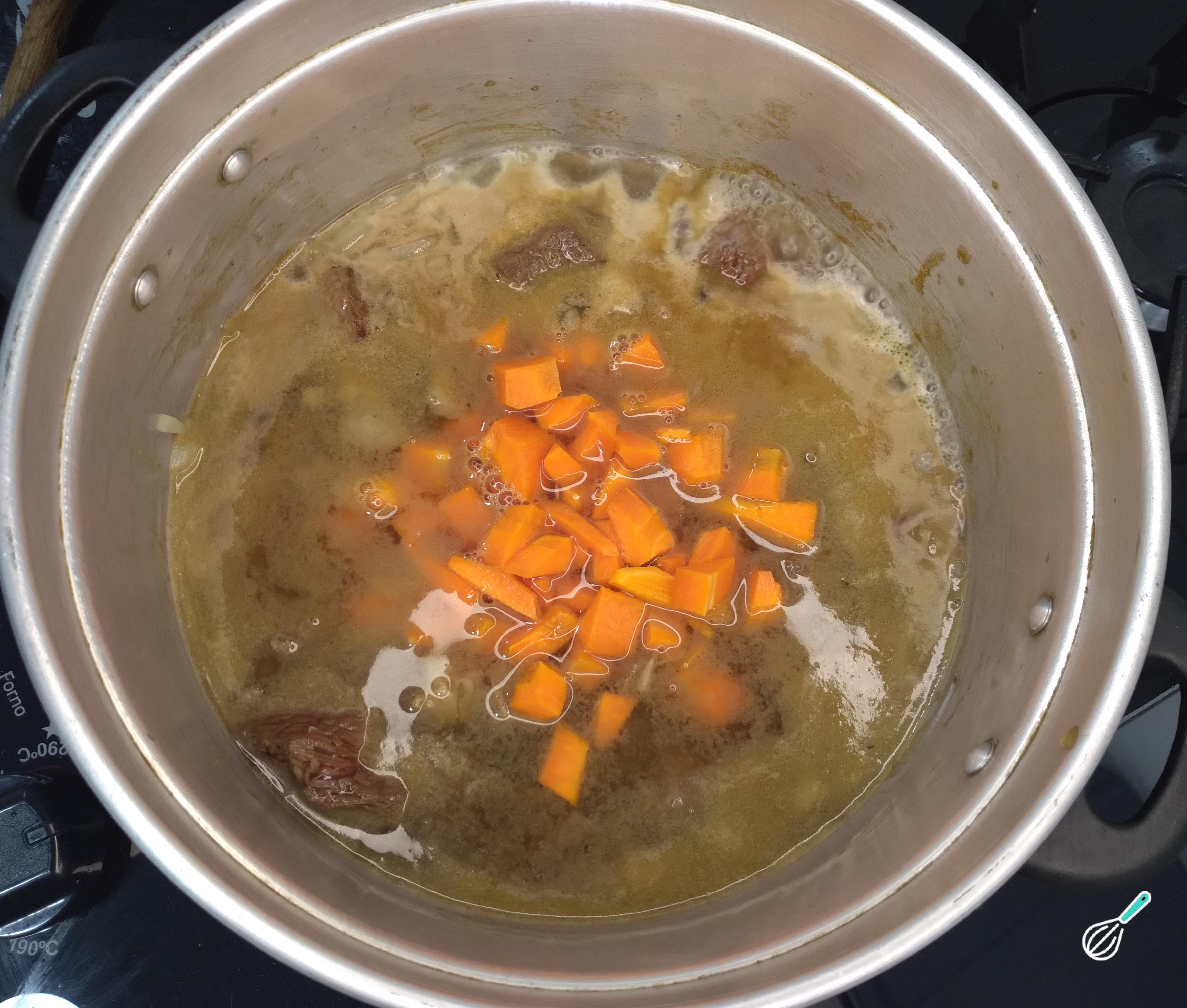 Para o próximo passo, cubra a carne com água e acrescente a cenoura cortada para cozinhar. A cenoura é um legume mais firme e precisa de um tempo maior de cozimento, sendo assim coloque a cenoura primeiro. Deixe que cozinhem, mantendo o fogo baixo.