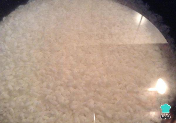 Junte o arroz na panela, mexa e junte a água e uma pitada de sal.