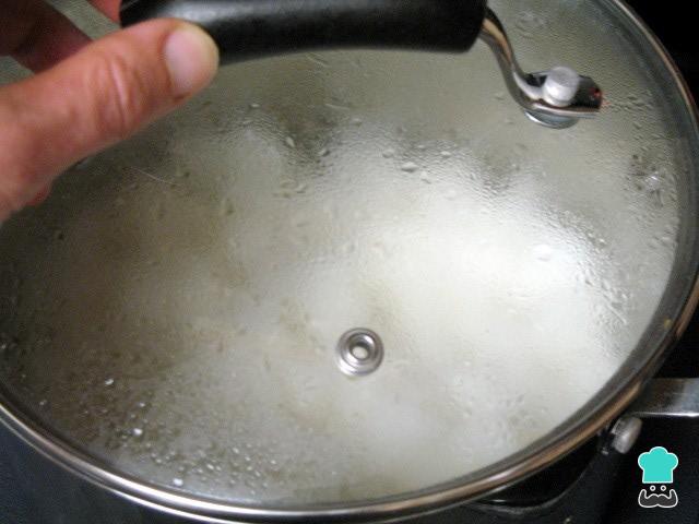 De seguida, junte a água e o champanhe e deixe cozer em fogo baixo. Quando o arroz estiver pronto, desligue o fogo, tampe a panela e deixe descansar por cerca de 10 minutos.