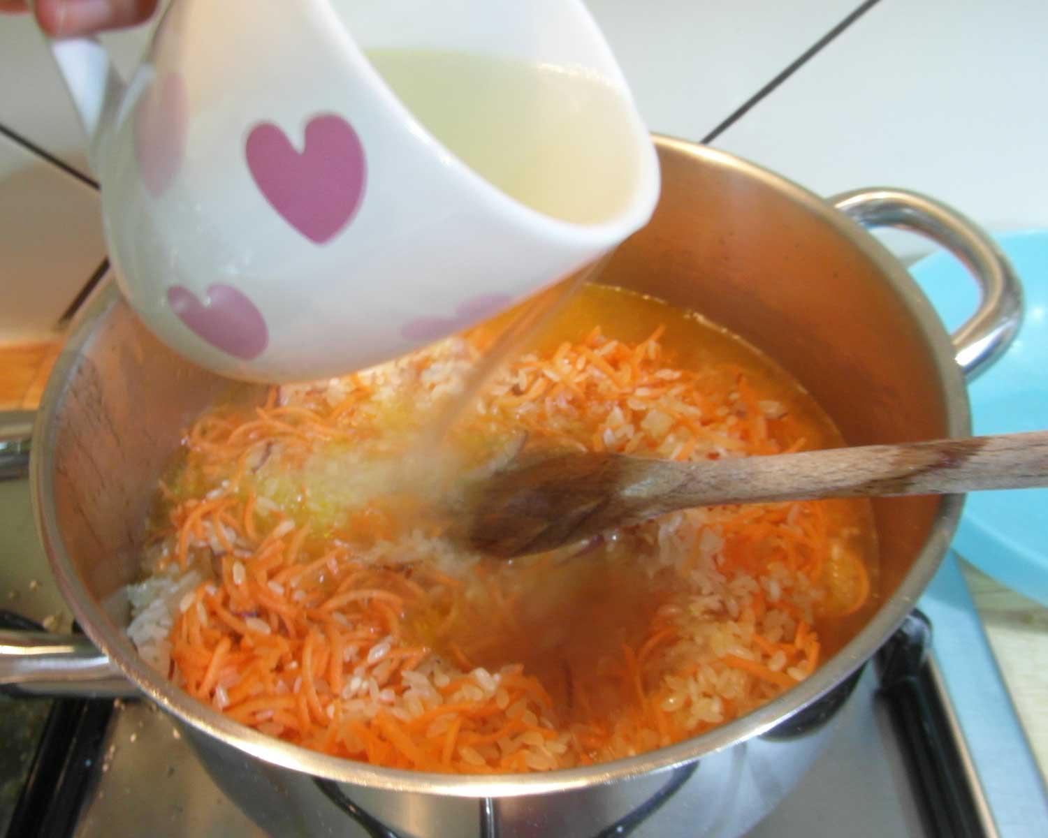 Junte o arroz, a cenoura, a água e o sal e deixe cozinhar com a panela semi tampada até a água secar quase toda. Nesse momento desligue o fogo.