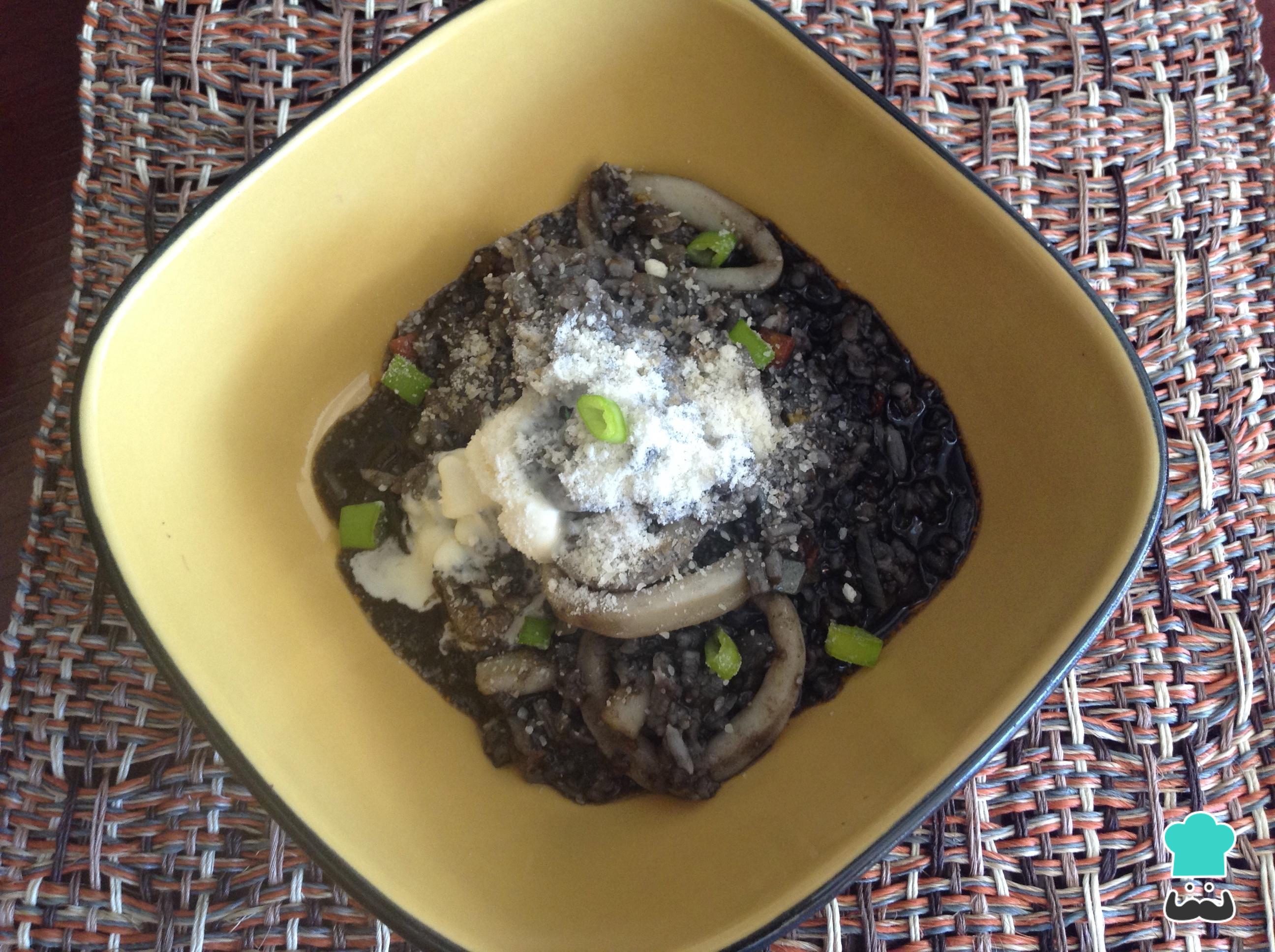 Finalmente sirva seu arroz negro com anéis de lula, polvilhado com um pouco de parmesão e cebolinha (opcional). Bom apetite!