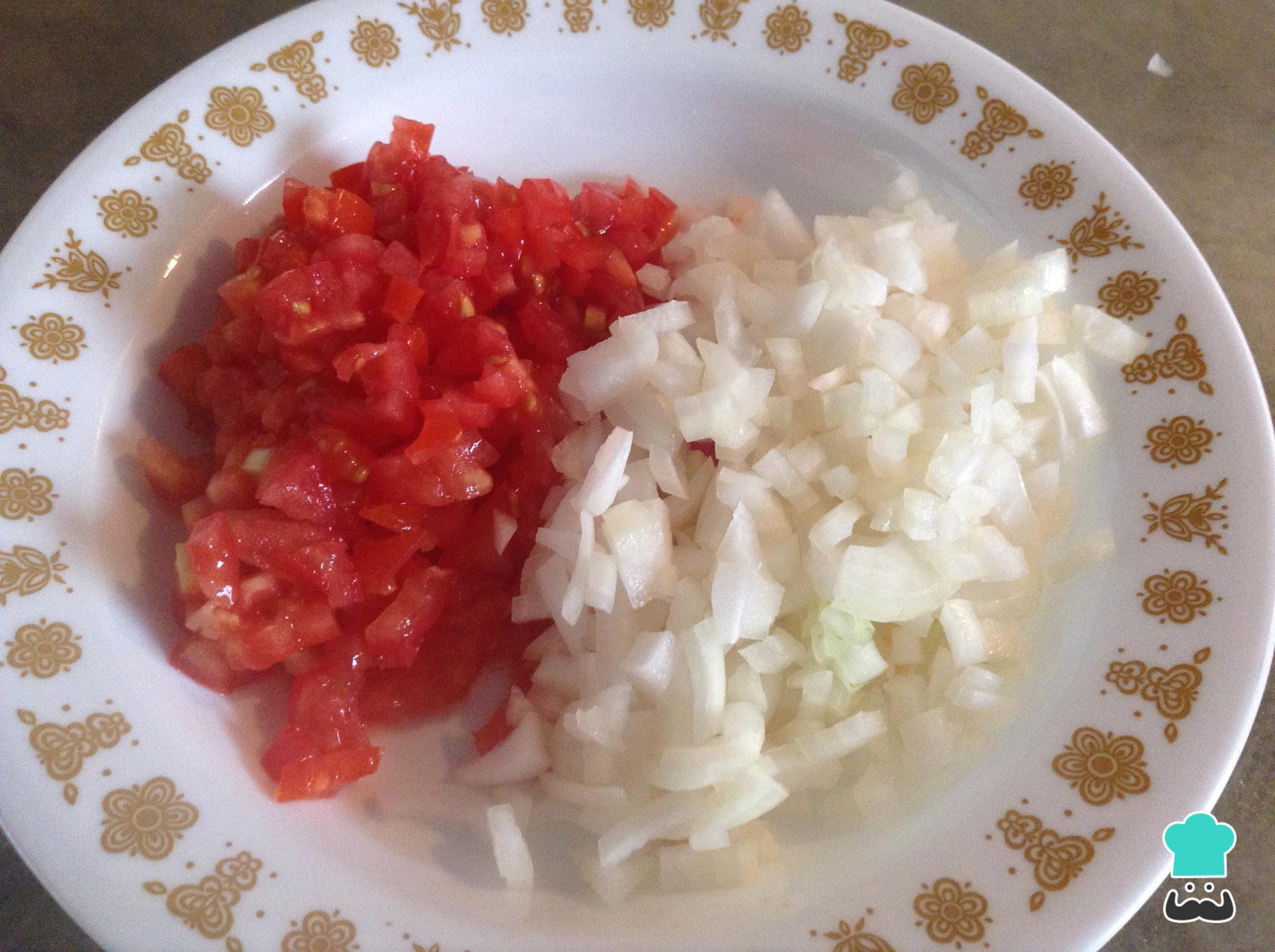 Lave e pique as cebolas e os tomates em cubos pequenos.