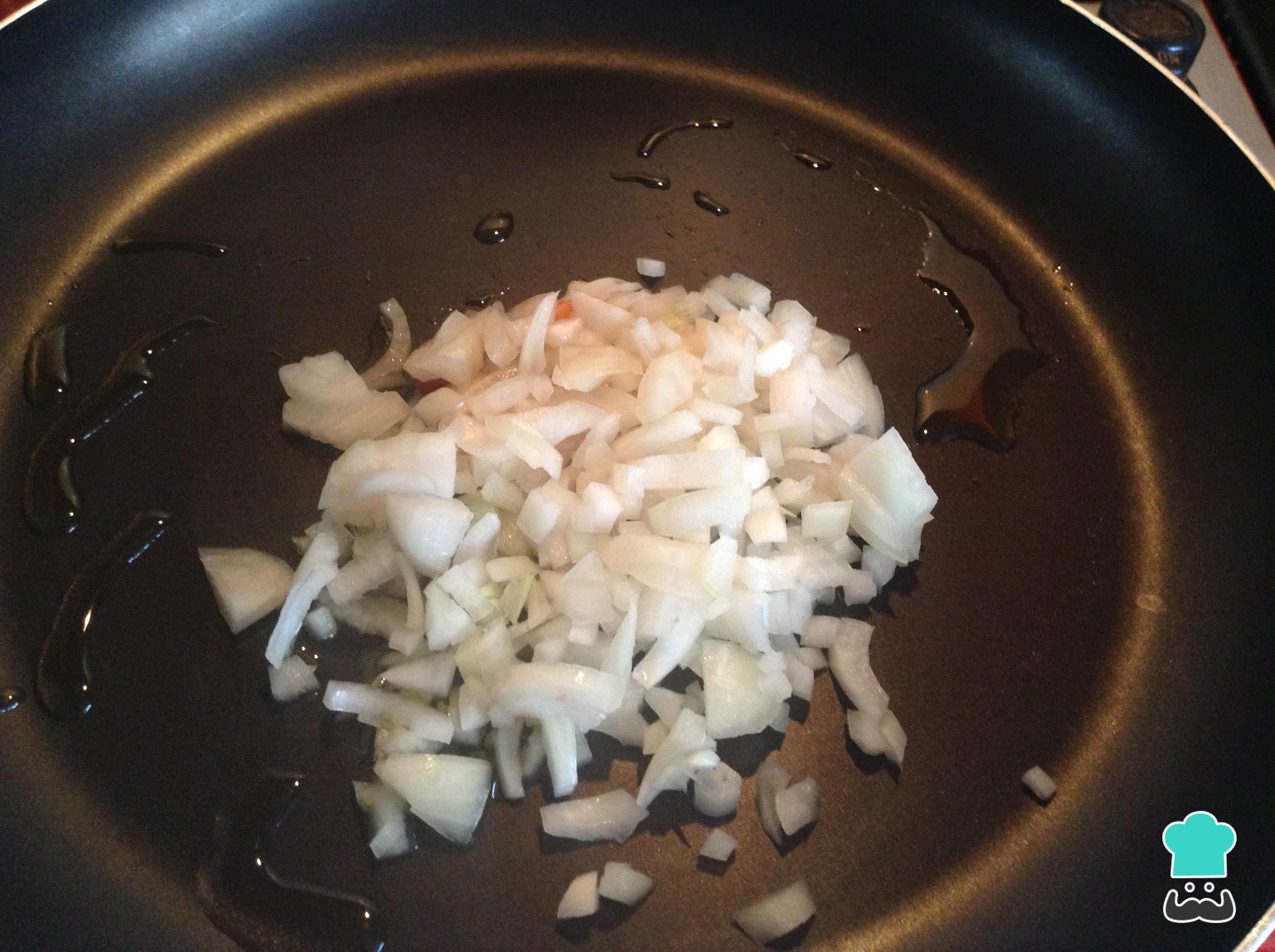 Coloque no fogo médio uma frigideira com um pouco de azeite. Cozinhe nela a cebola até ficar transparente.