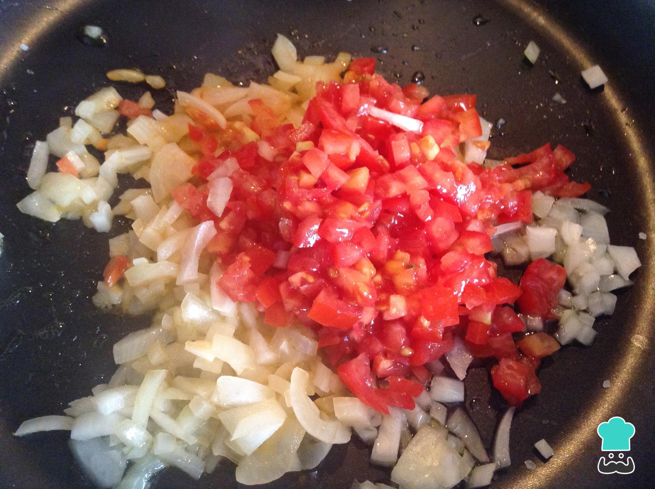 Adicione os tomates picados e os dentes de alho. Refogue bem e reserve.