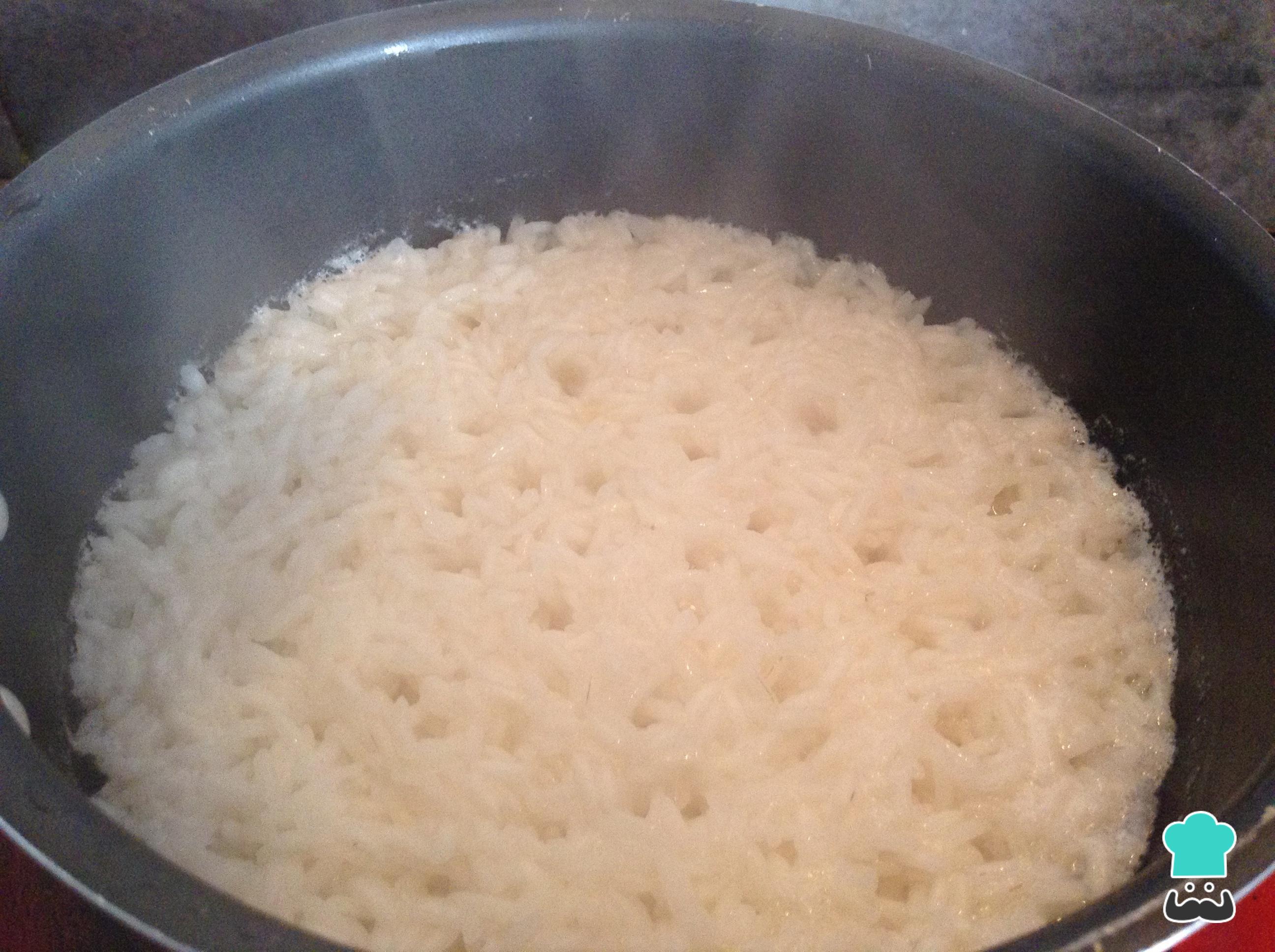Prepare o arroz da maneira tradicional: sendo que estamos usando 1 xícara de arroz, terá de usar 2 xícaras de água para cozinhar. Tempere com sal e reserve.
