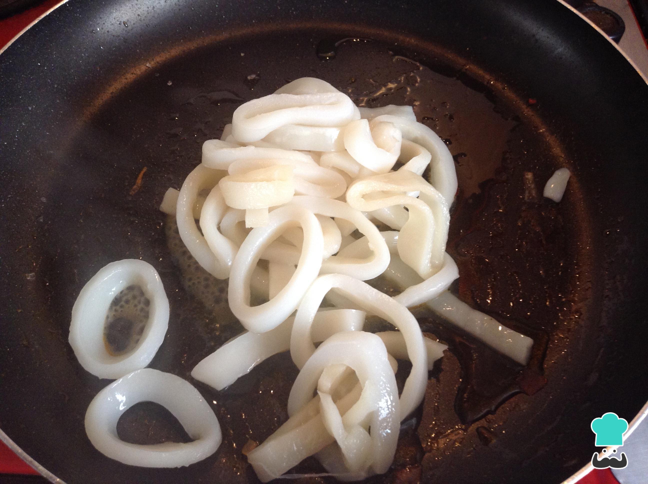 Cozinhe agora os anéis de lula na frigideira, novamente com um pouco de azeite.