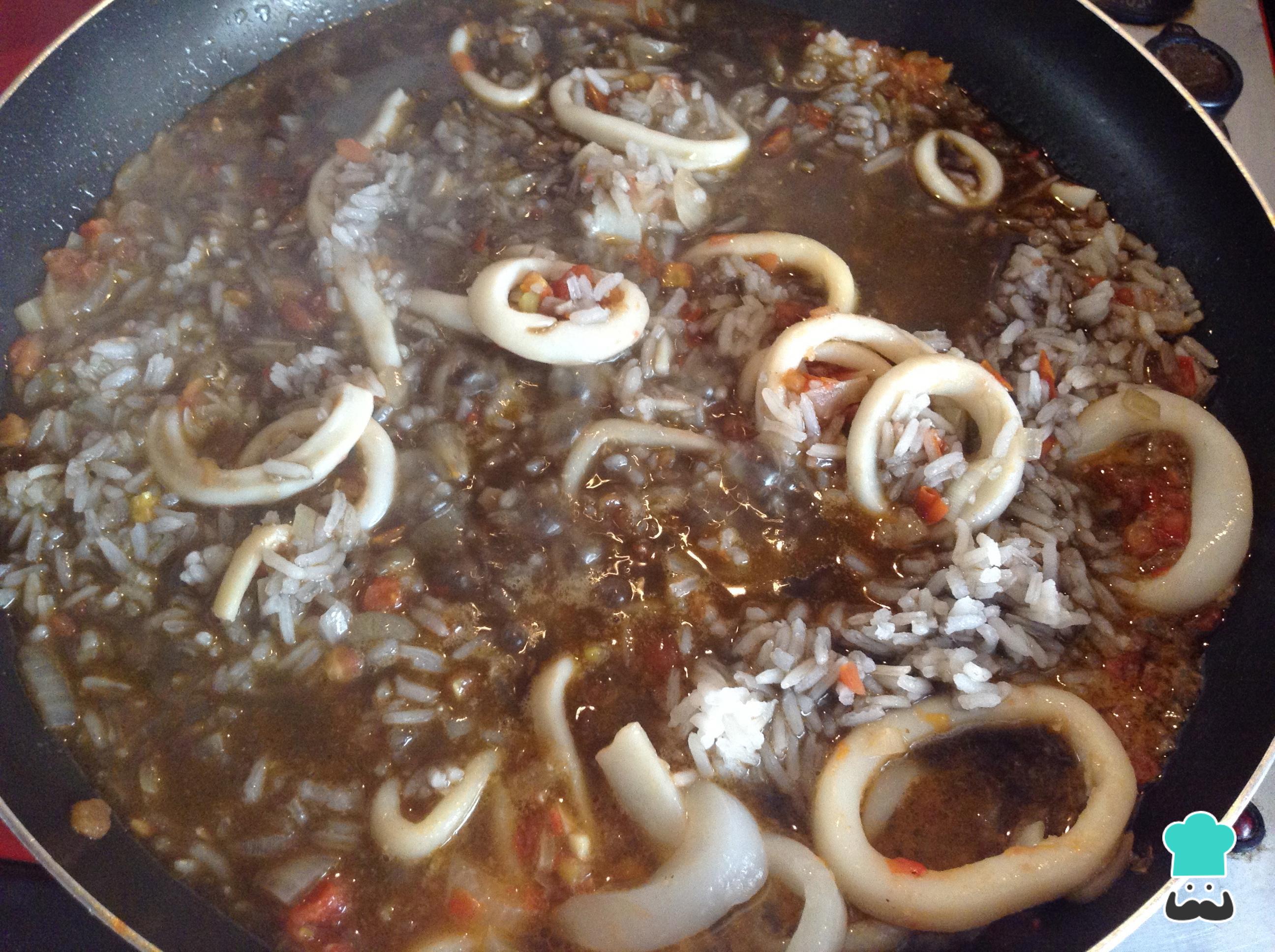 Adicione o arroz e a tinta de lula e misture bem. Cozinhe em fogo baixo por 10 minutos, e desligue o fogo.