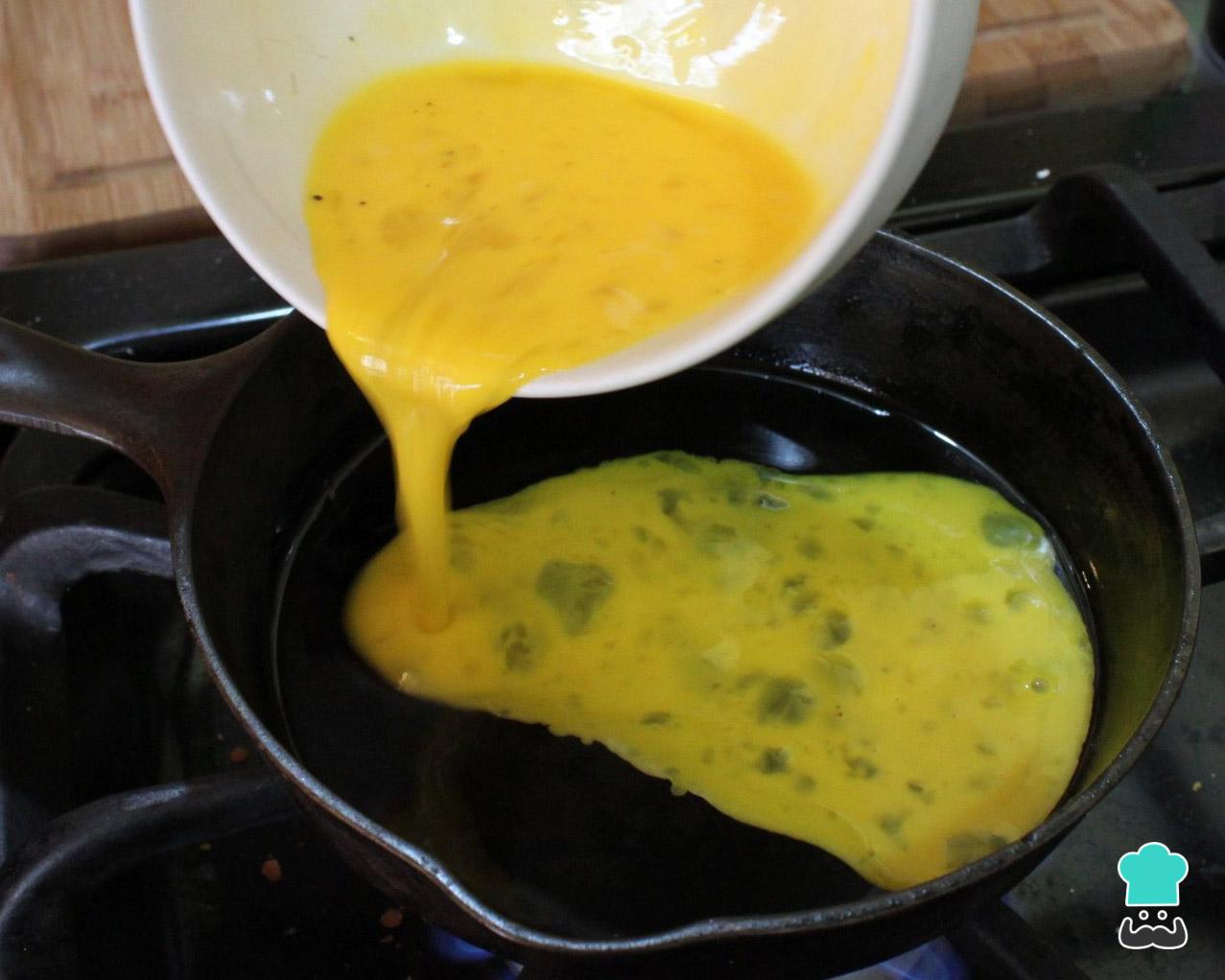 À parte bata os ovos com um pouco de sal. Leve ao fogo uma frigideira com um fio de óleo e, quando estiver quente, coloque os ovos batidos. Deixe cozinhar até obter uma omelete e desligue o fogo.