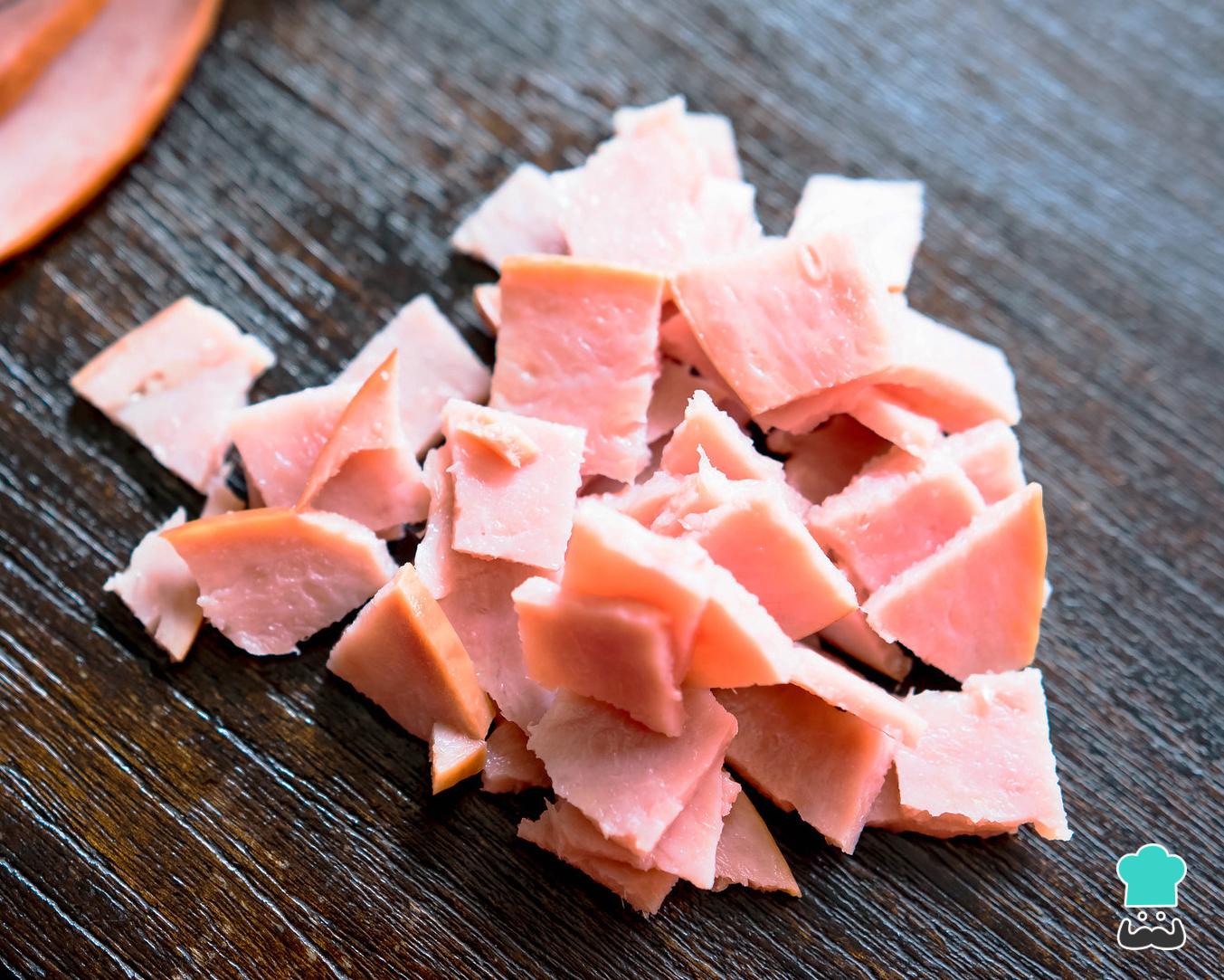 Pique essa omelete de ovo em pedacinhos ou corte em tiras e reserve. Pique o presunto do mesmo jeito: em pedacinhos, cubinhos ou em tiras.