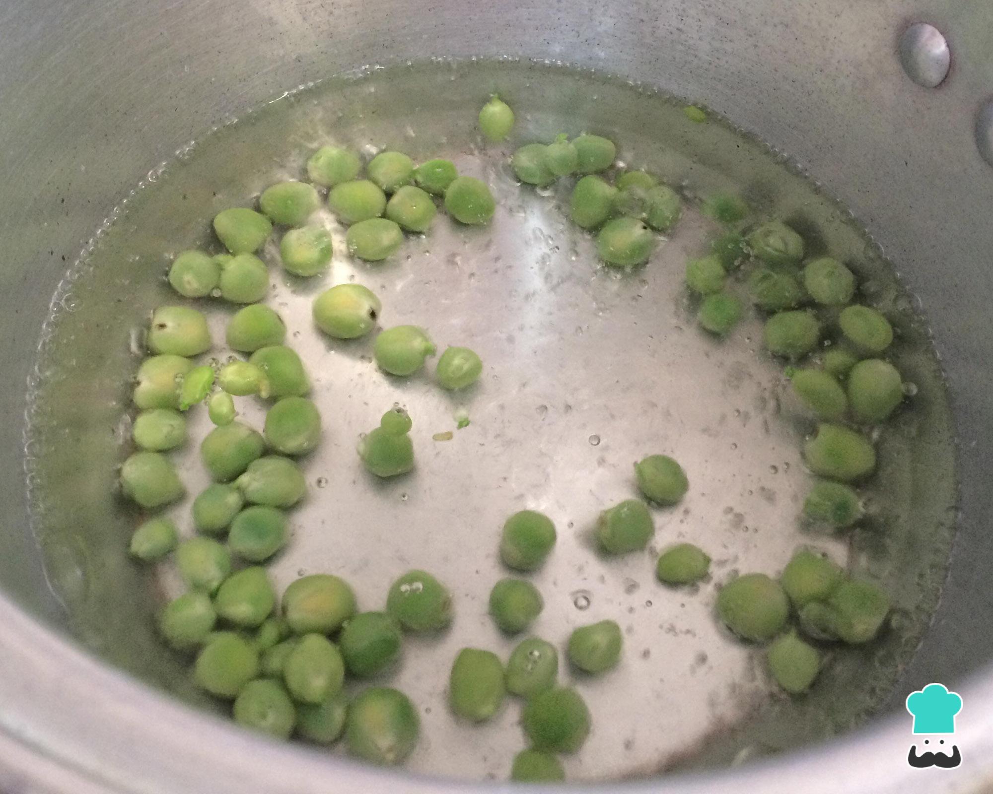 Descasque as cenouras e pique em pedaços. Leve ao fogo uma panela com água e um pouco de sal e cozinhe nela as ervilhas e as cenouras por 5 minutos (contando a partir do momento em que a água ferve). Depois escorra a água e reserve.