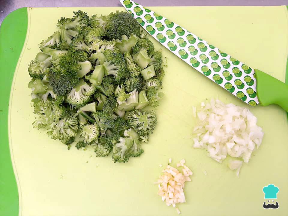 Pique o brócolis cru em floretes, corte ou rale a cebola e pique o alho.