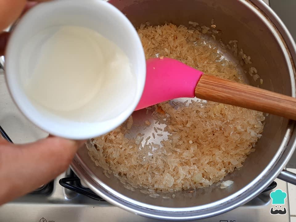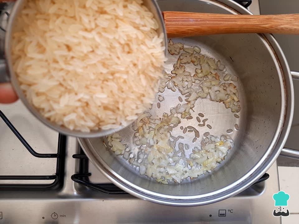 Numa panela média, em fogo baixo, aqueça o óleo rapidamente e refogue a cebola. Em seguida refogue o alho e adicione o arroz cru. Deixe o arroz fritando por pelo menos 1 minuto nesse refogado, mexendo sempre para que ele não grude ou queime. Esse truque também ajudará a que tenhamos um arroz soltinho!