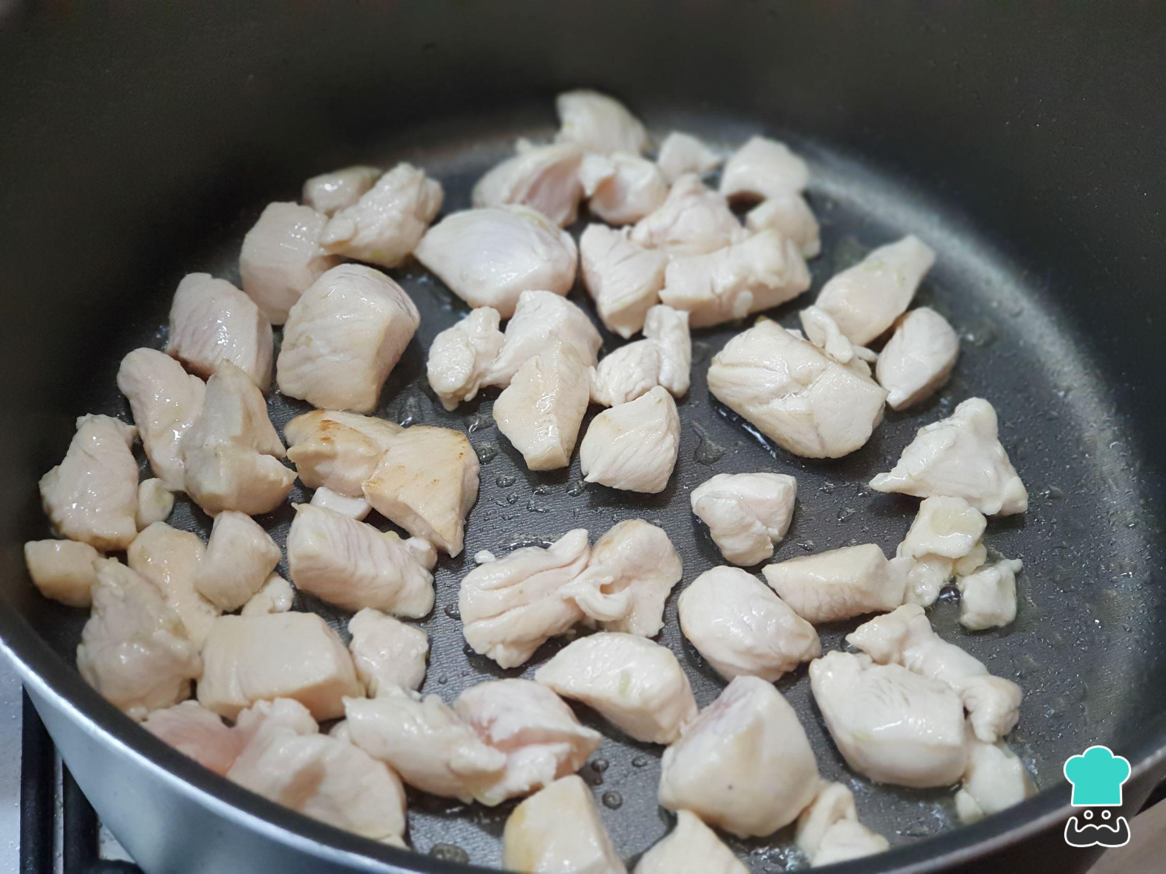 Corte os filés de frango em pequenos cubos e, em uma panela média, doure-os em azeite.