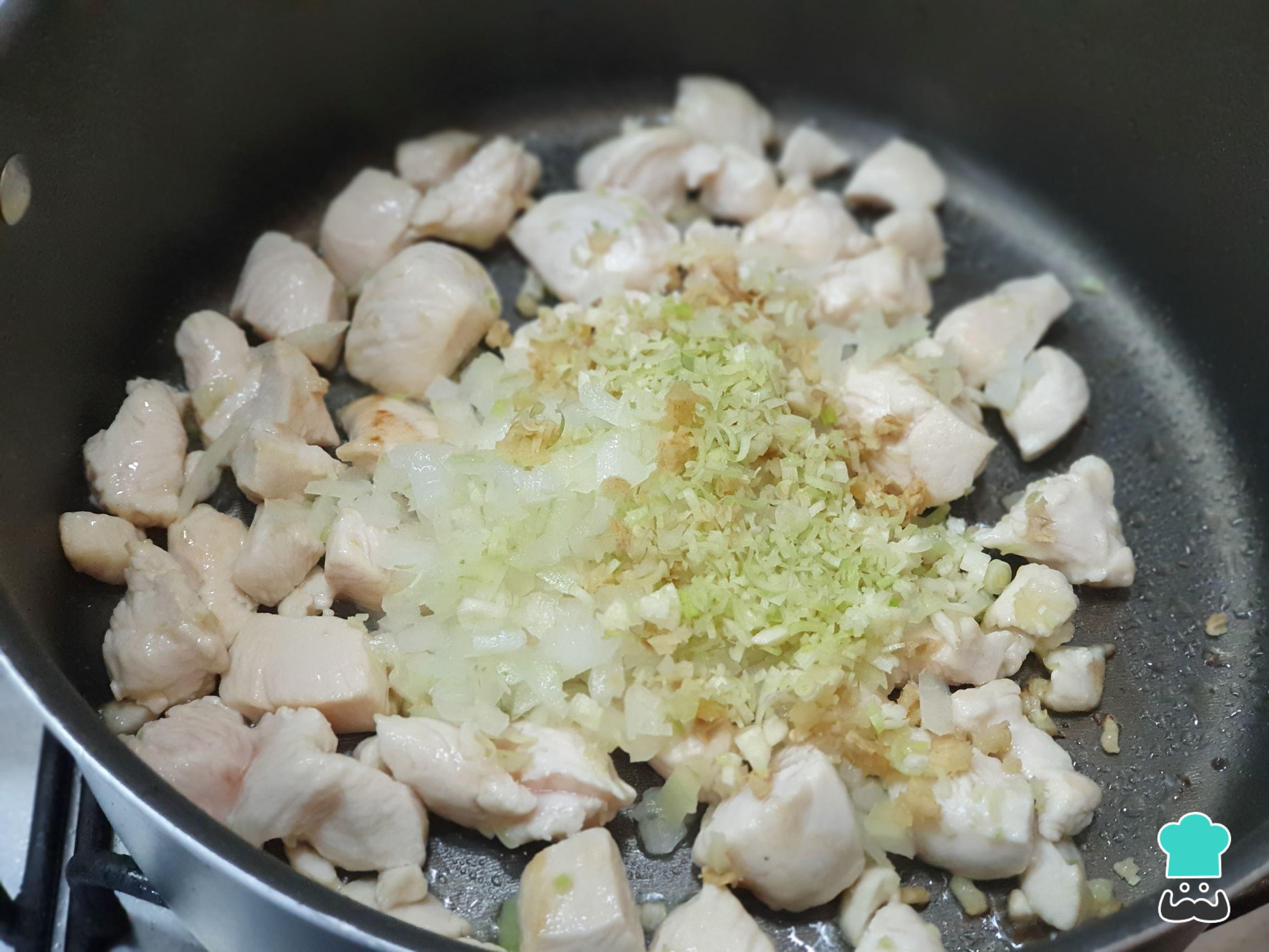 Quando os cubos de frango começarem a dourar, acrescente os temperos: a cebola, o alho, o gengibre e o capim limão. Mexa muito bem.