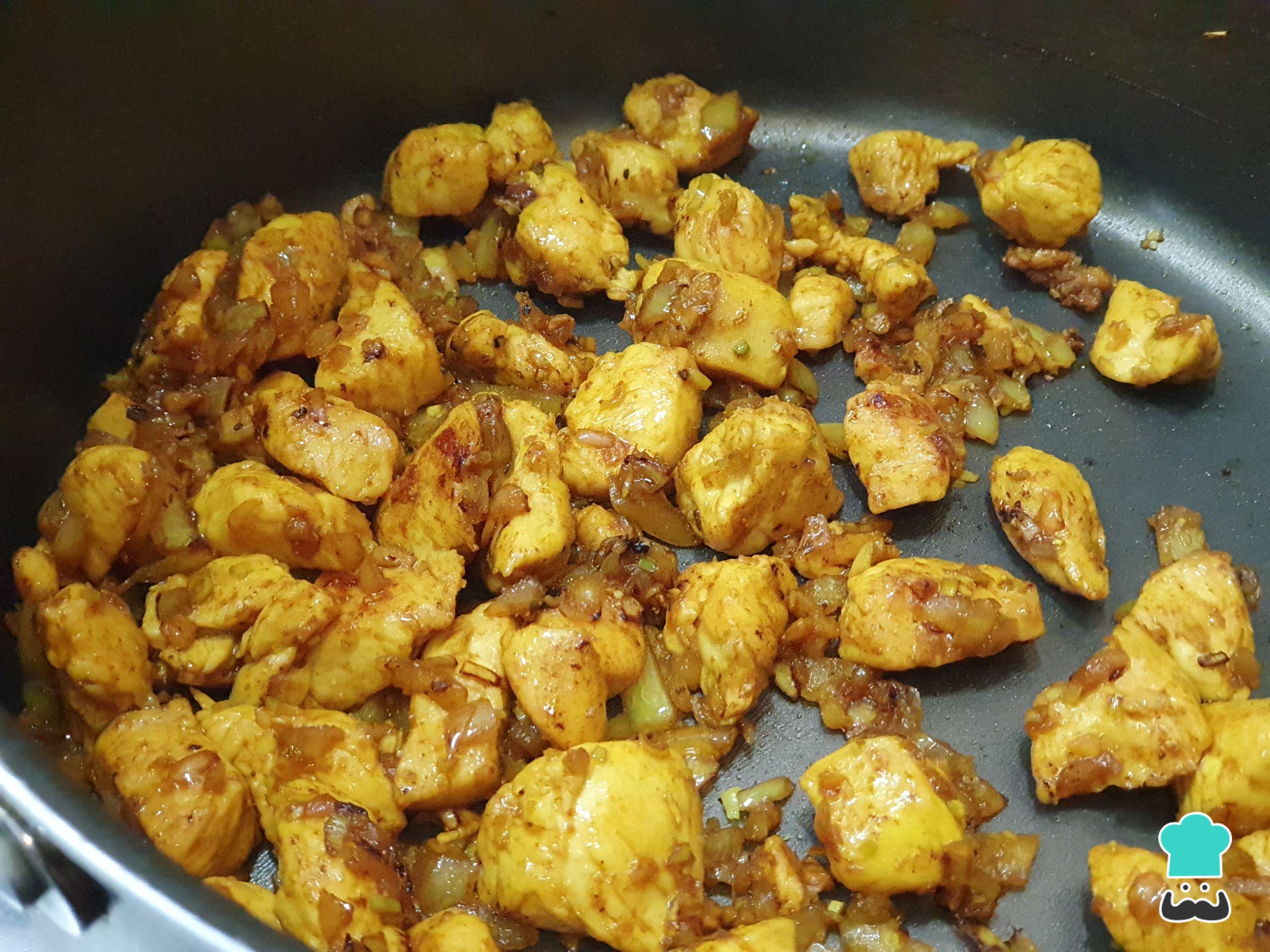 Refogue o frango e os temperos até que estejam bem dourados e caramelizados. Tempere com sal.