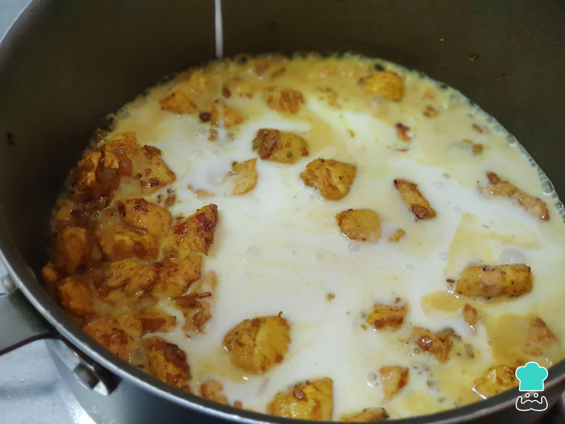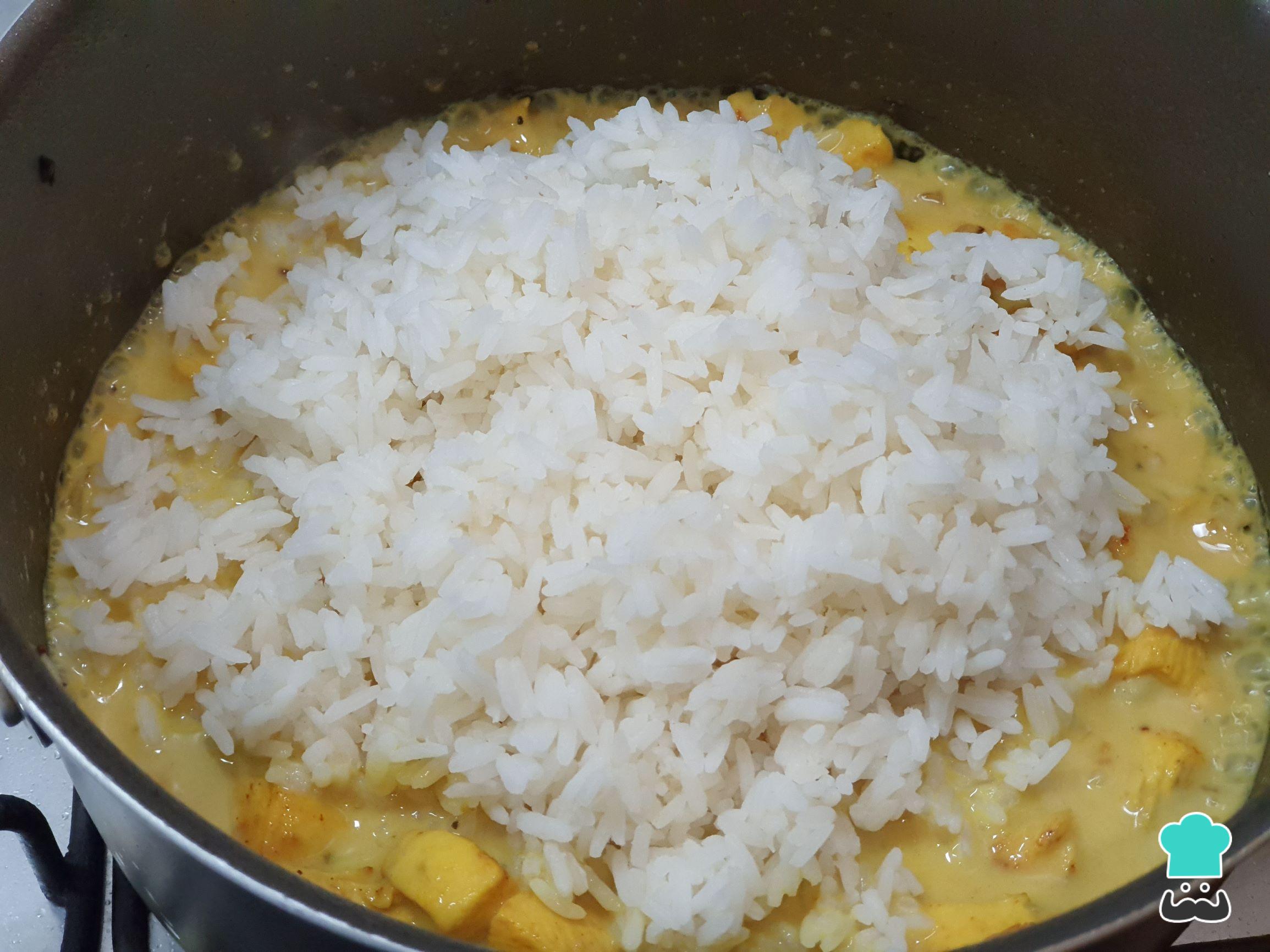 Por fim, junte o arroz já cozido e ainda quente no frango ao leite de coco e incorpore tudo muito bem.