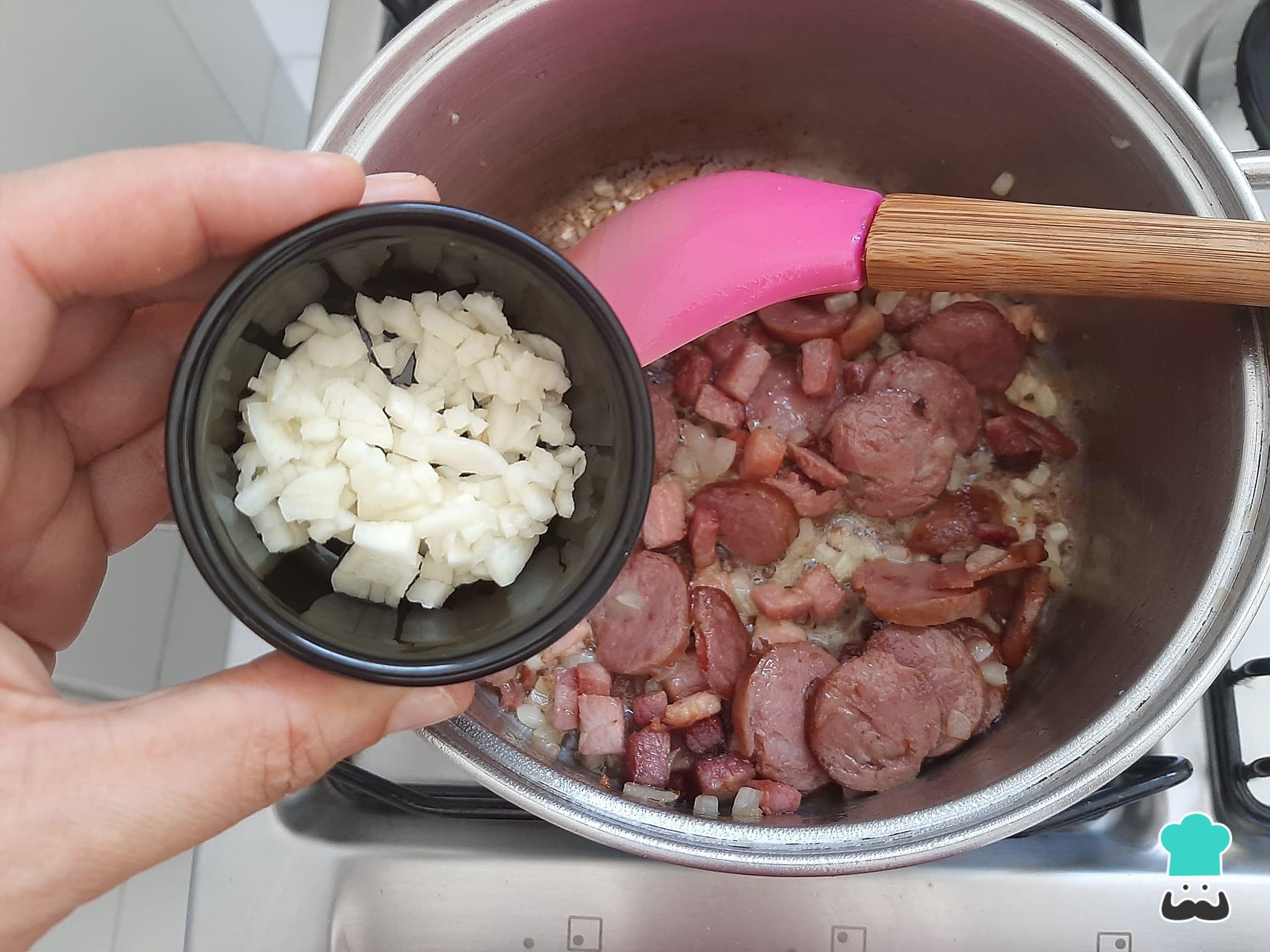Numa panela média, aqueça o azeite de oliva e refogue o bacon, a calabresa e a cebola picada por alguns minutos. Em seguida adicione o alho picado e refogue mais um pouco.