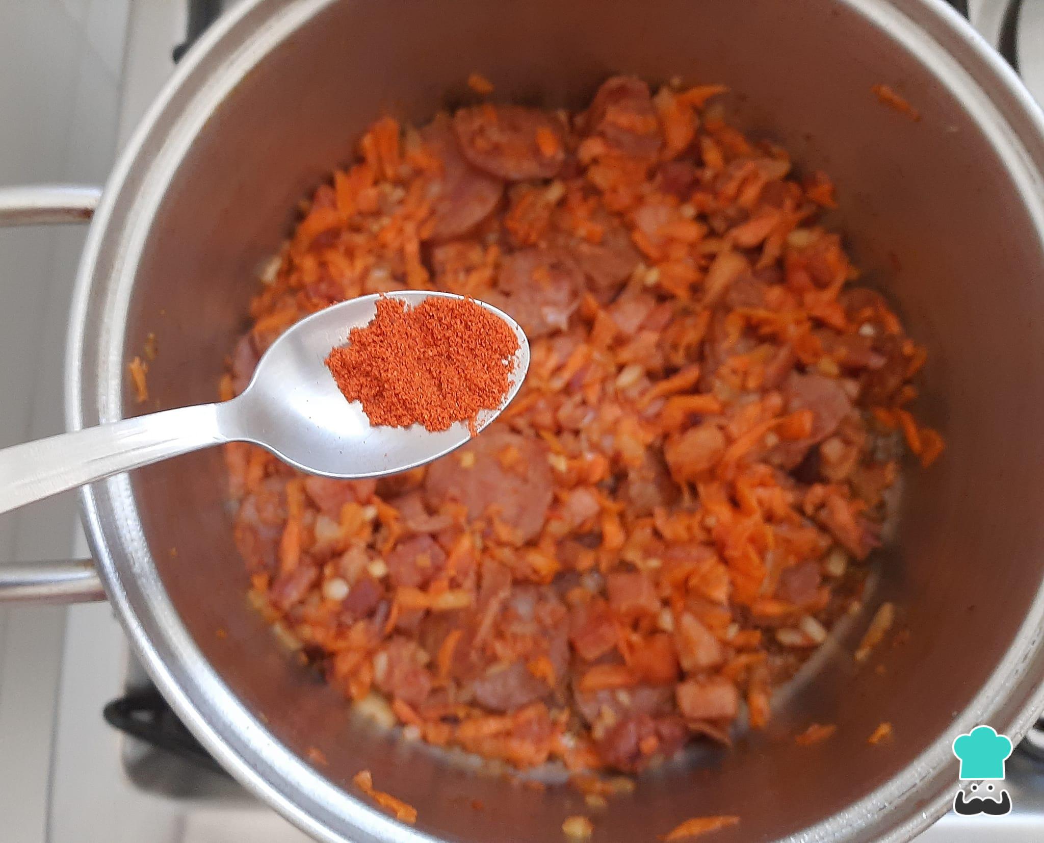 Junte a cenoura ralada ao refogado e tempere com sal e páprica picante ou defumada, para conferir mais cor e sabor no seu arroz!