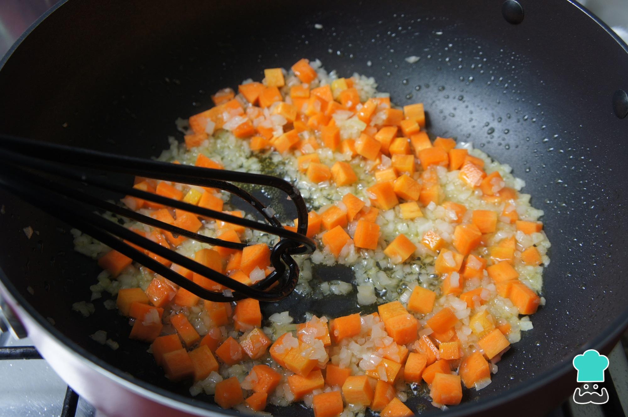 Enquanto o frango cozinha, cozinhe o arroz: comece por fazer um refogado em fogo médio com o azeite, a cebola e a cenoura raladas ou picadas finamente. Quando estiverem macias, adicione o tomate também picado e sem sementes, e deixe murchar.
