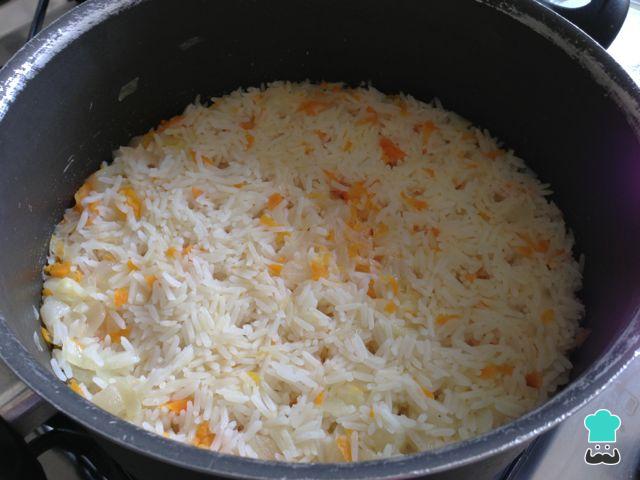 Acrescente arroz, deixe fritar ligeiramente, e cubra com o dobro de água (neste caso, 400ml). Tempere com sal, tampe e deixe cozinhar pelo tempo indicado na embalagem. Depois desligue o fogo e deixe repousar tampado, para absorver a água restante.