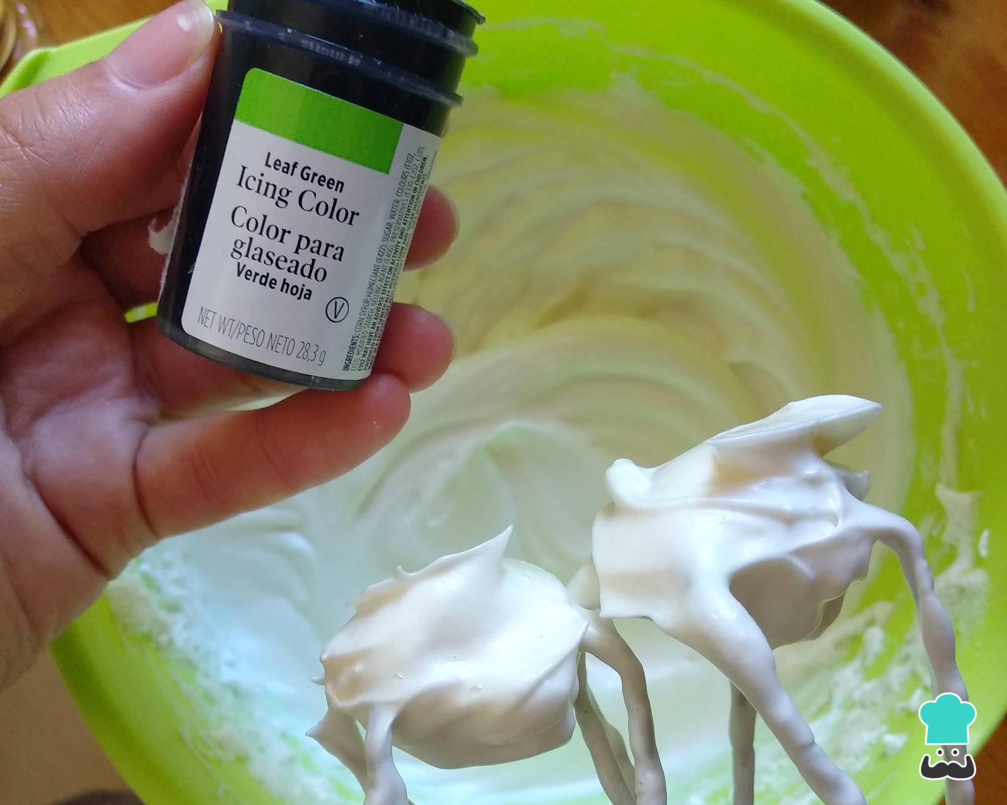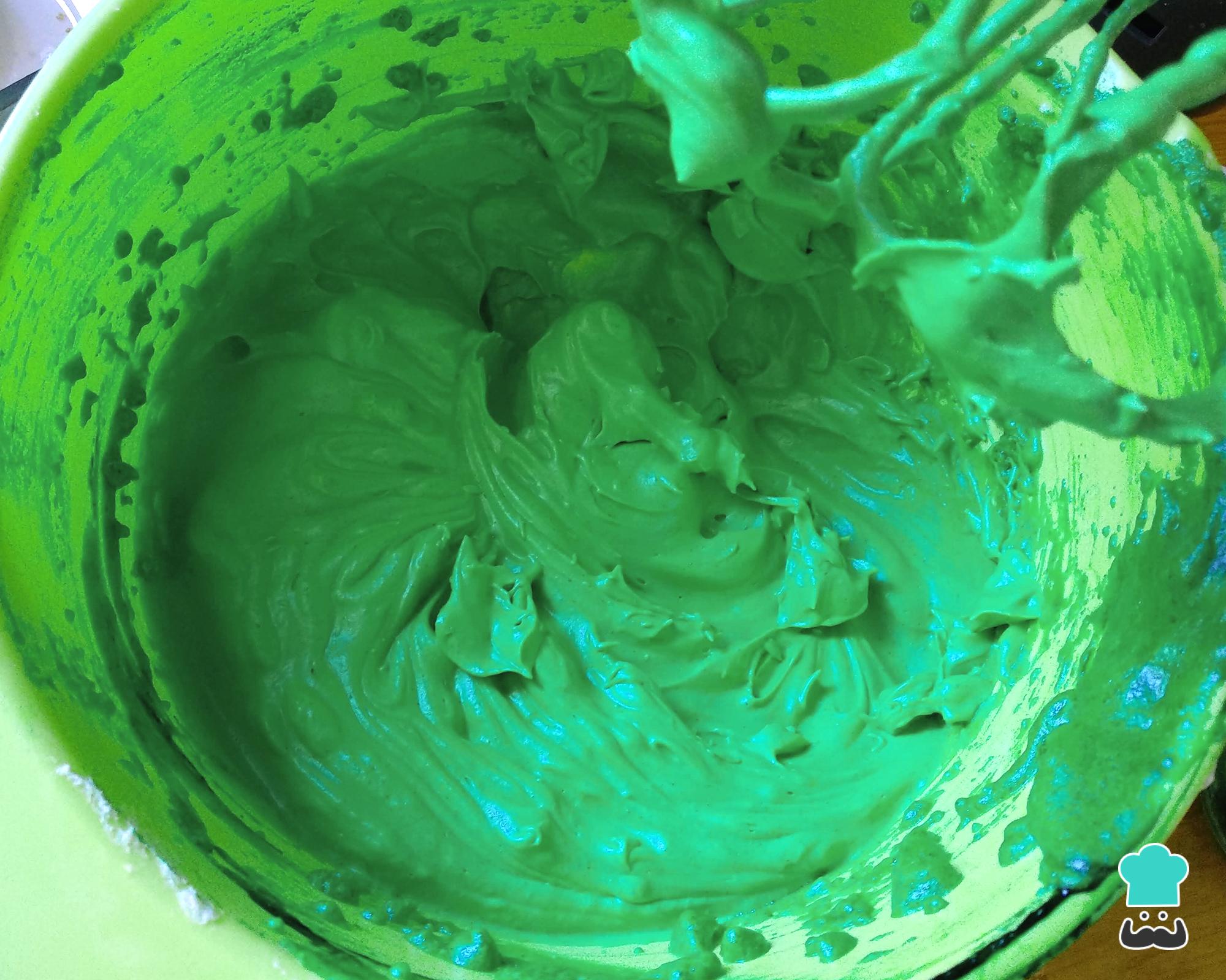Bata somente até misturar bem o corante no suspiro. O resultado deverá ser um suspiro verde com a cor bem misturada, se ele não ficar verde o suficiente coloque mais um pouco de corante.