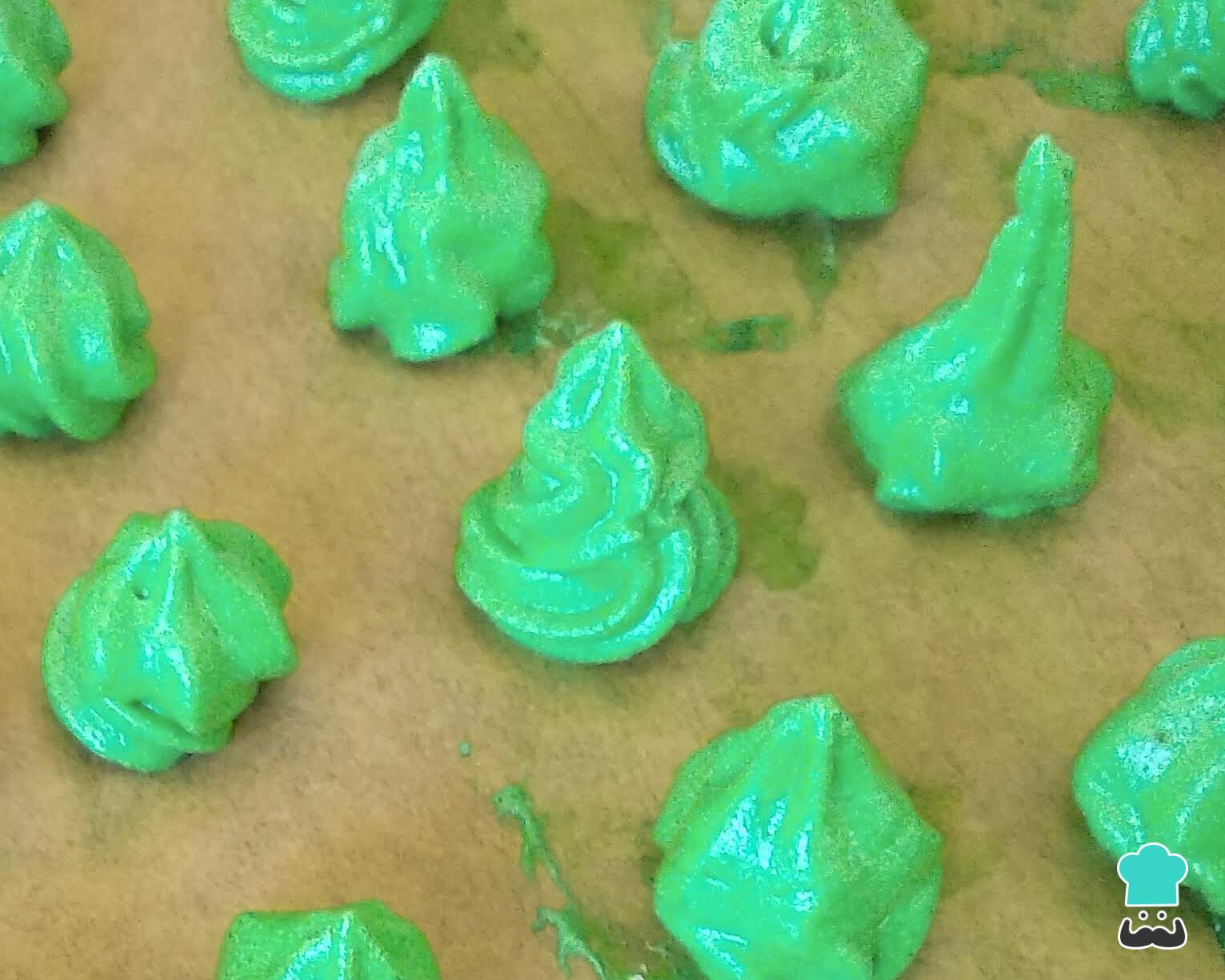 Coloque o suspiro natalino num saco de confeiteiro e, no tabuleiro forrado previamente, forme pequenos montinhos de suspiro semelhantes a árvores, como o suspiro no meio da fotografia. Lembre de deixar um espaço entre os suspiros, pois eles irão crescer um pouco à medida que assam.