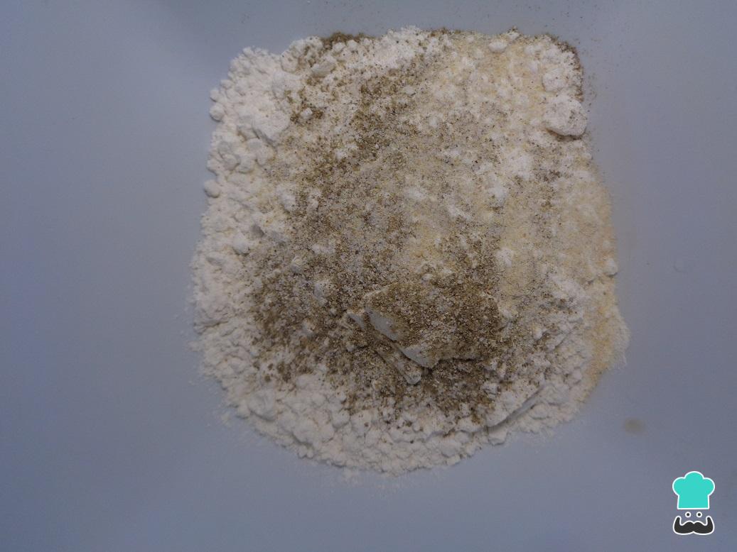 Em seguida misture o sal, a pimenta e o sal de alho com a farinha. Essa mistura será usada para empanar esta receita de asas de frango assadas.