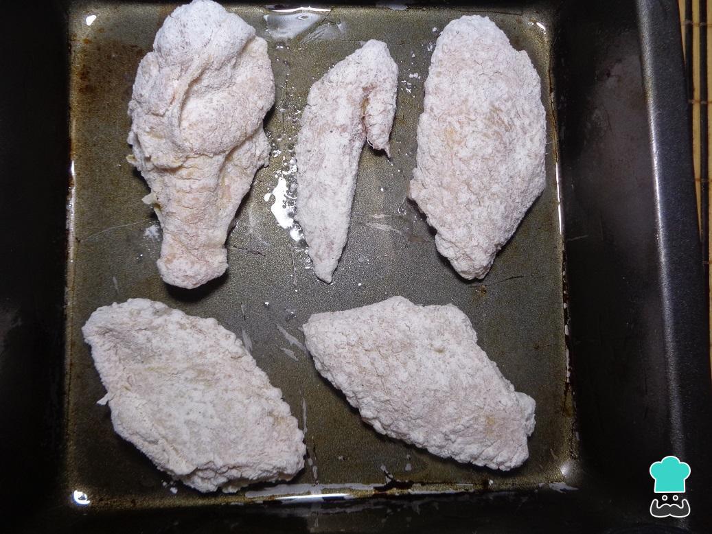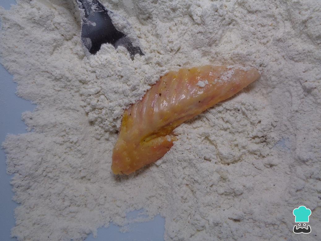Envolva as asas de frango na farinha anterior certificando-se de que ficam bem empanadas. Isso será mais fácil devido ao suco de limão, que permite que a farinha grude rapidamente.