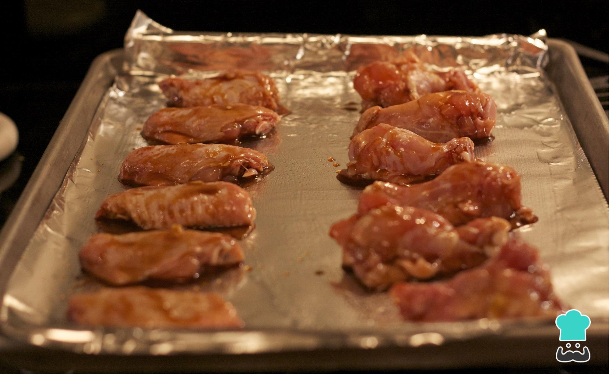Adicione as asinhas de frango e envolva bem na marinada. Tampe com papel alumínio e reserve na geladeira de um dia para o outro ou, no mínimo, 1-2 horas, para que pegue todos os sabores.