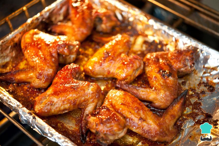 Após o tempo indicado, retire o papel alumínio que cobre as asinhas, vire-as ao contrário e pincele nelas mais um pouco da marinada. Leve de novo ao forno por mais 30 minutos, desta vez sem cobrir.