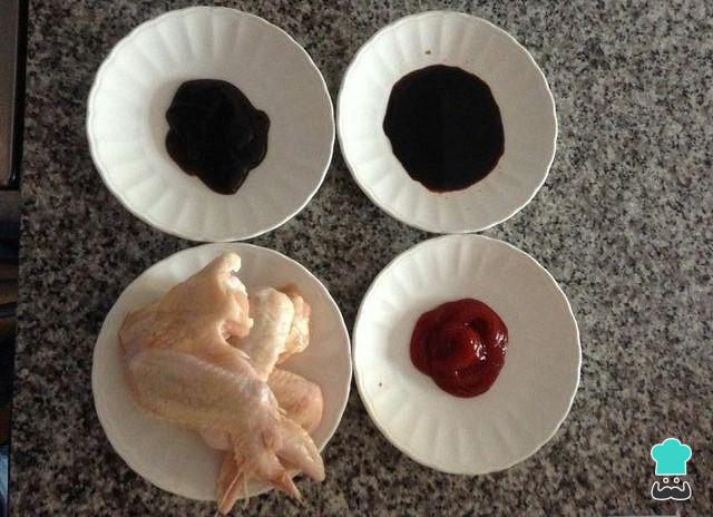 Para fazer esta receita de asinhas de frango picantes comece por reunir os ingredientes. O molho de ostras você pode encontrar em quase todo o supermercado.