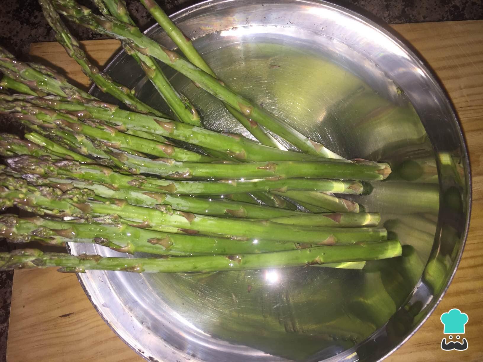 Corte os pés dos aspargos lave-os e coloque-os em uma taça com água durante dois minutos com umas gotas de vinagre, para assim ficarem bem limpos.