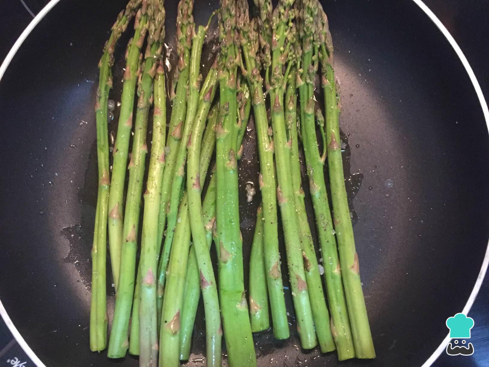 Coloque o azeite em uma frigideira, adicione os aspargos, tempere com sal, pimenta do reino e salteie até os aspargos ficarem macios.