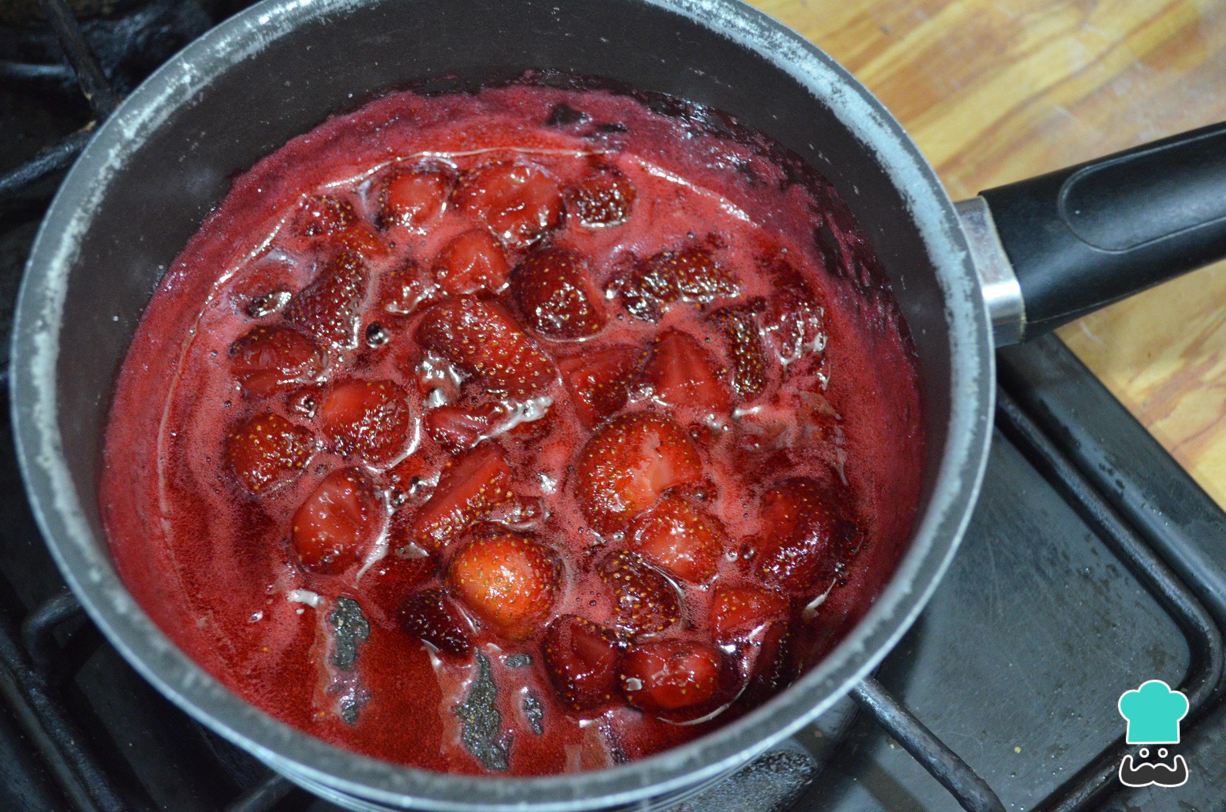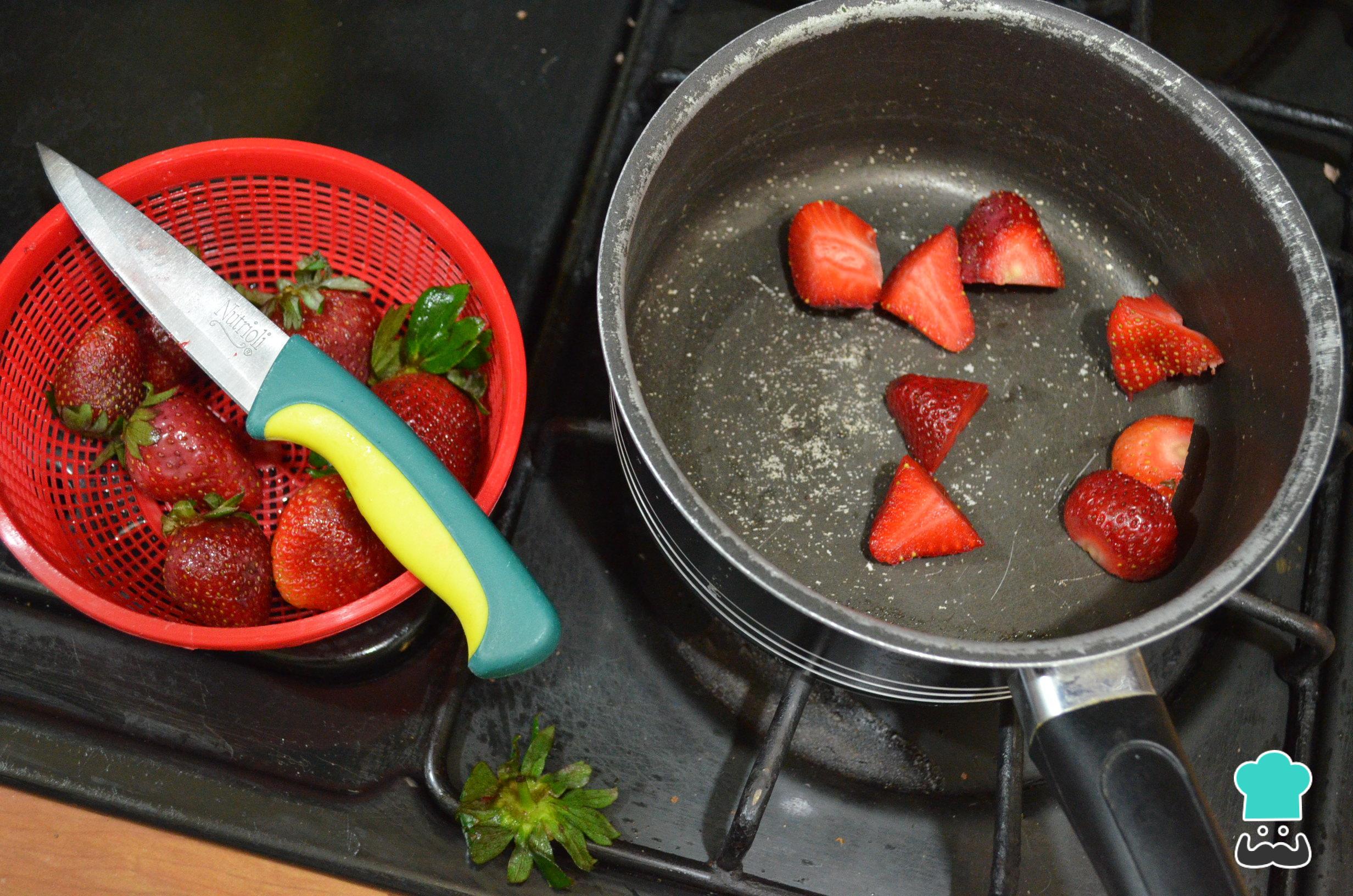 Coloque os morangos em uma panela junto com o açúcar, e leve ao fogo médio. Deixe cozinhar, até que os morangos amoleçam a formem uma calda espessa. Quando isso acontecer, desligue o fogo e deixe amornar.