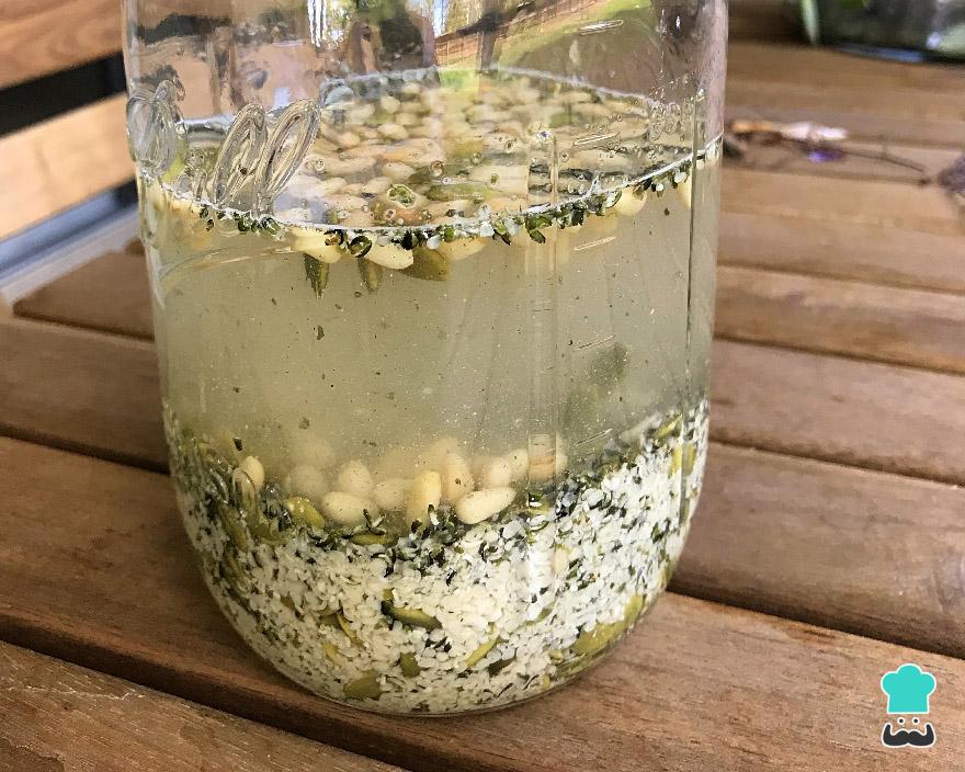 Primeiro de tudo, deixe as sementes de abóbora, de hemp e os pinholes de molho entre 8 e 12 horas, até dobrarem de tamanho. Esse passo é importante para deixar as sementes com uma textura mais macia.