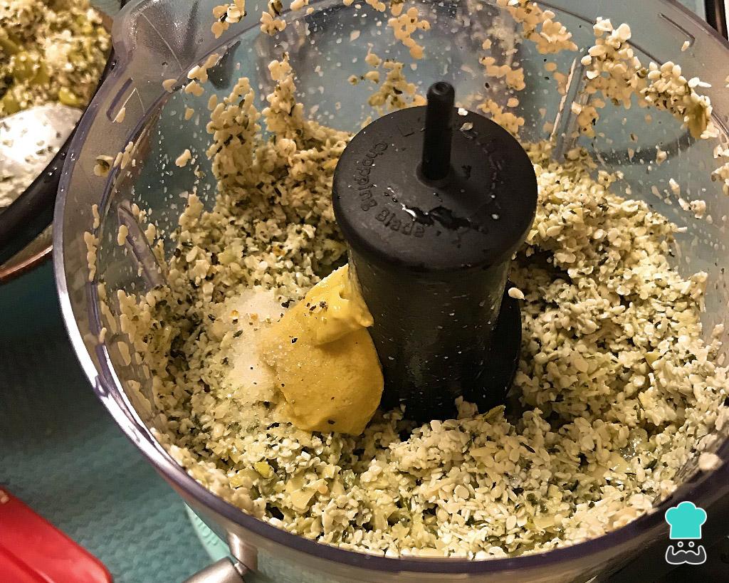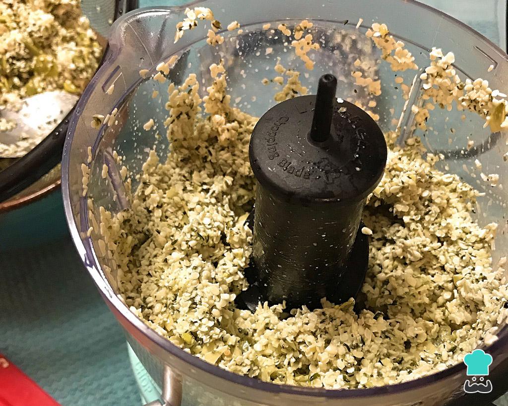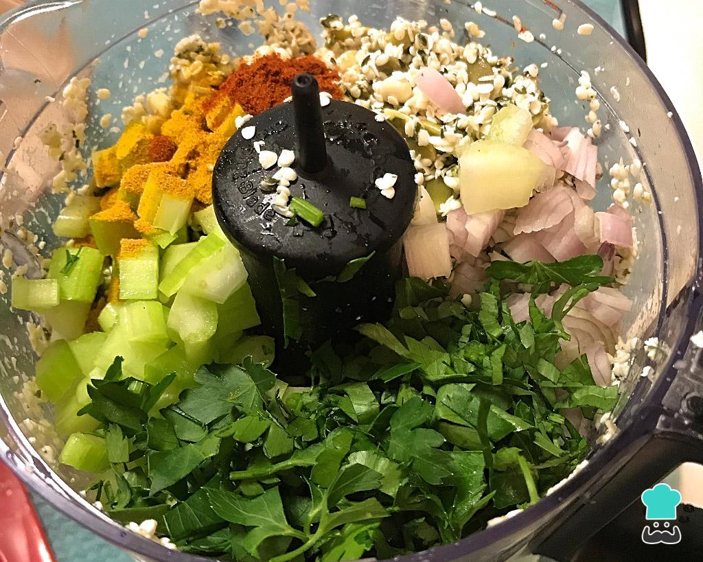 Adicione então o restante das sementes e o restante dos temperos: a salsinha, a páprica, a cúrcuma, o salsão e a echalote ou cebola. Pulse até tudo ficar bem misturado em uma pastinha semelhante a farofa.