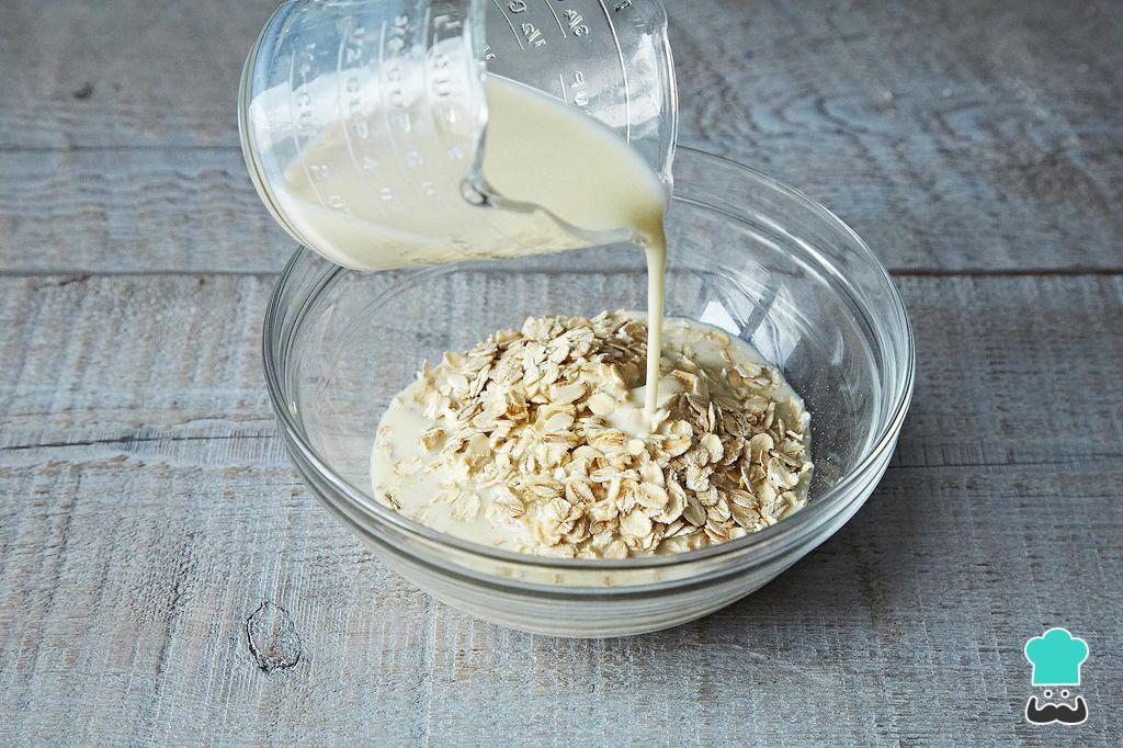 Comece por colocar a aveia em uma tigela ou pote e acrescentar o leite. Tampe e reserve na geladeira durante a noite.