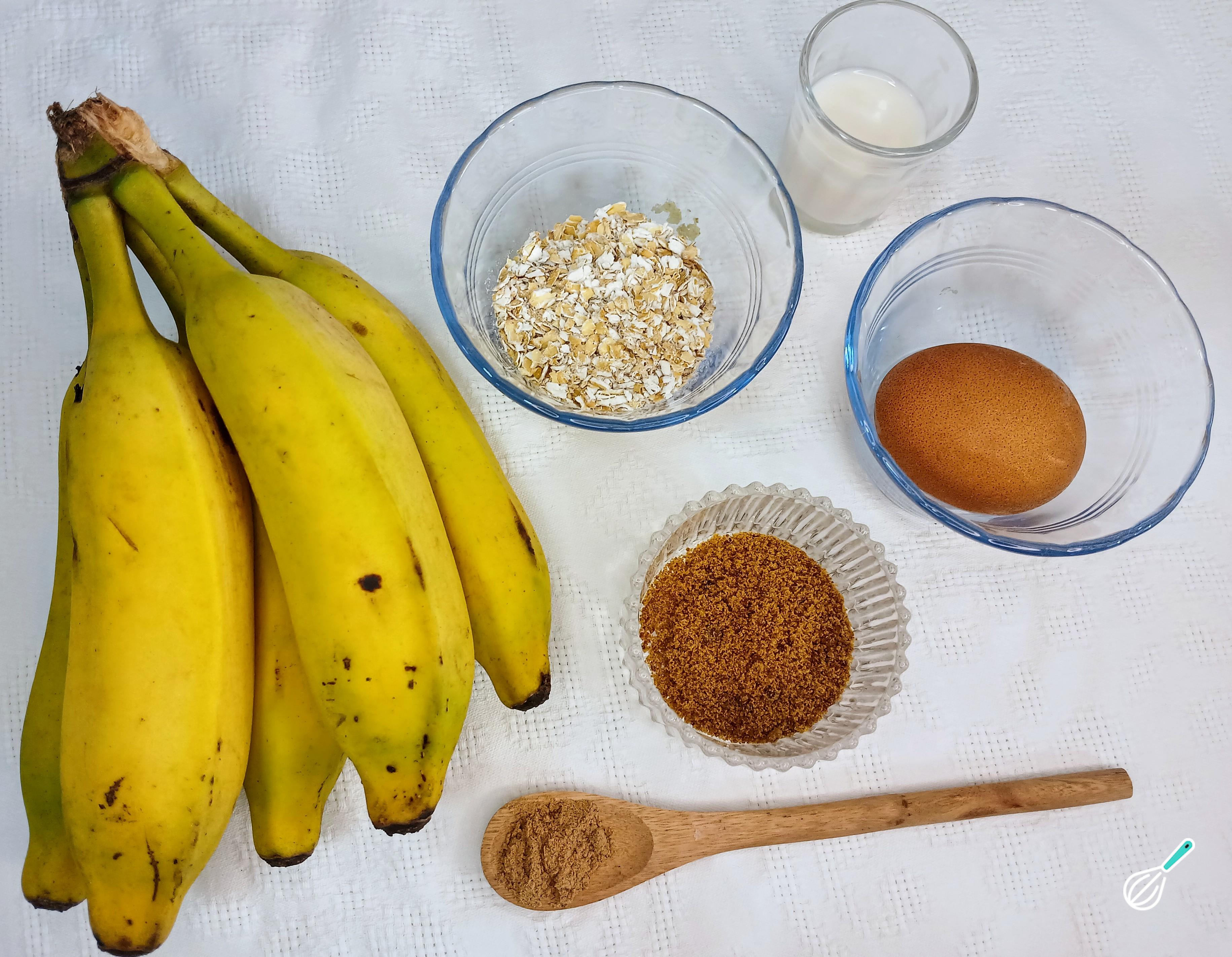 Comece separando os ingredientes para o preparo da aveioca de banana. Separe as bananas, o açúcar mascavo, a aveia, o ovo, o leite e a canela.