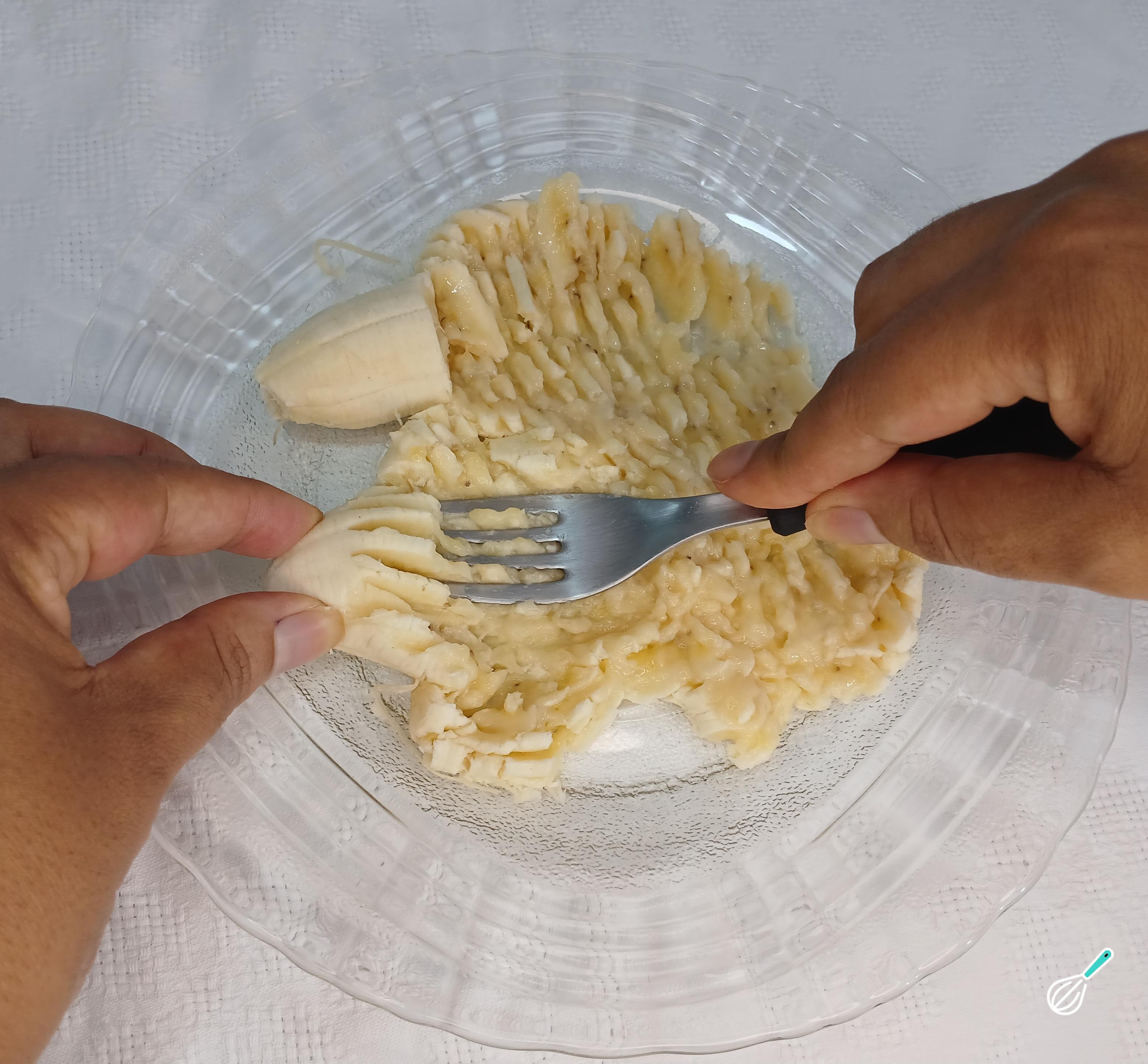 Feito isso,descasque duas bananas e em prato amasse-as com um garfo. Deixe-as bem amassadas para preparar a aveioca.