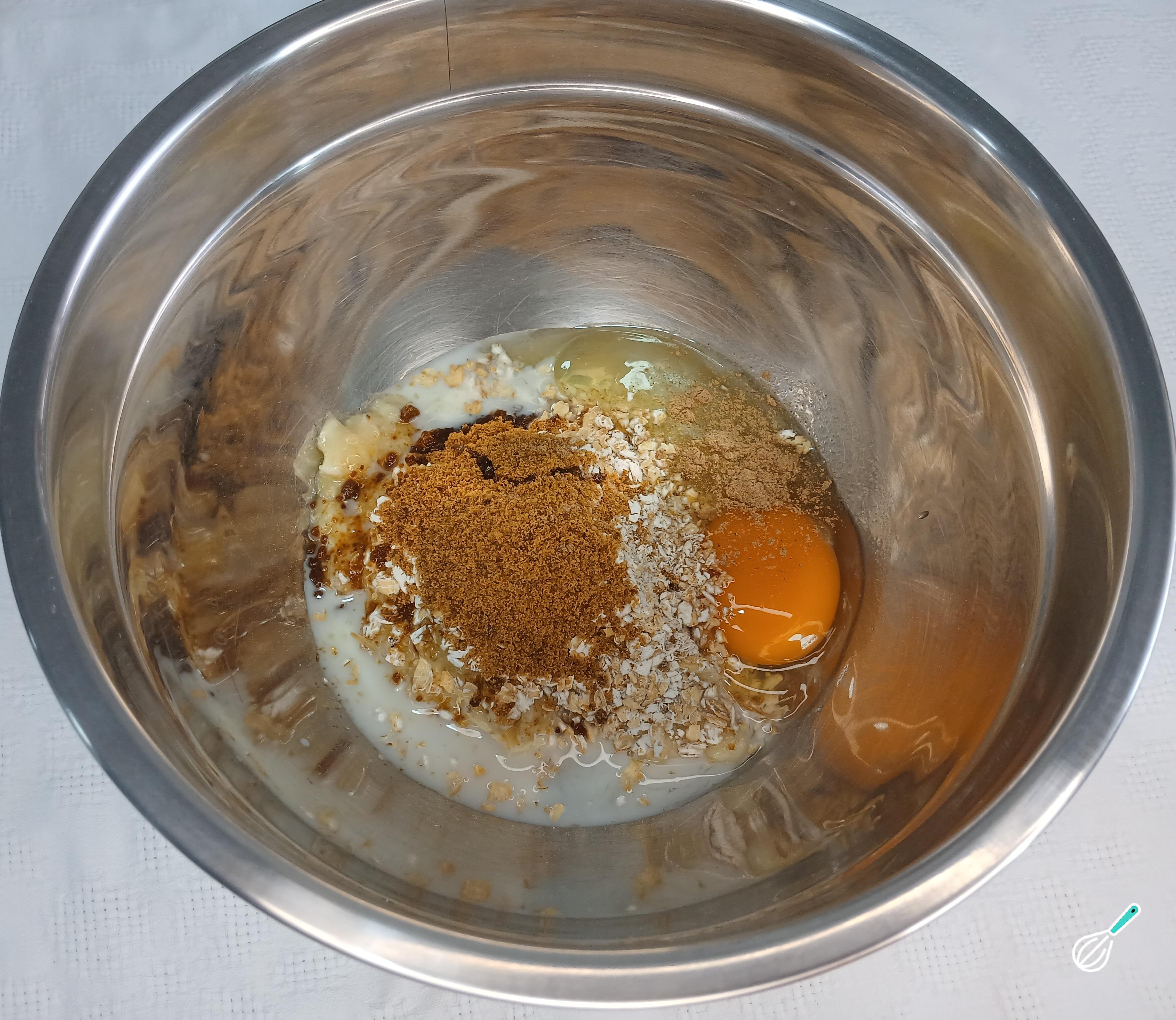 Em um bowl, coloque a aveia, o açúcar, o ovo, o leite e as bananas amassadas.