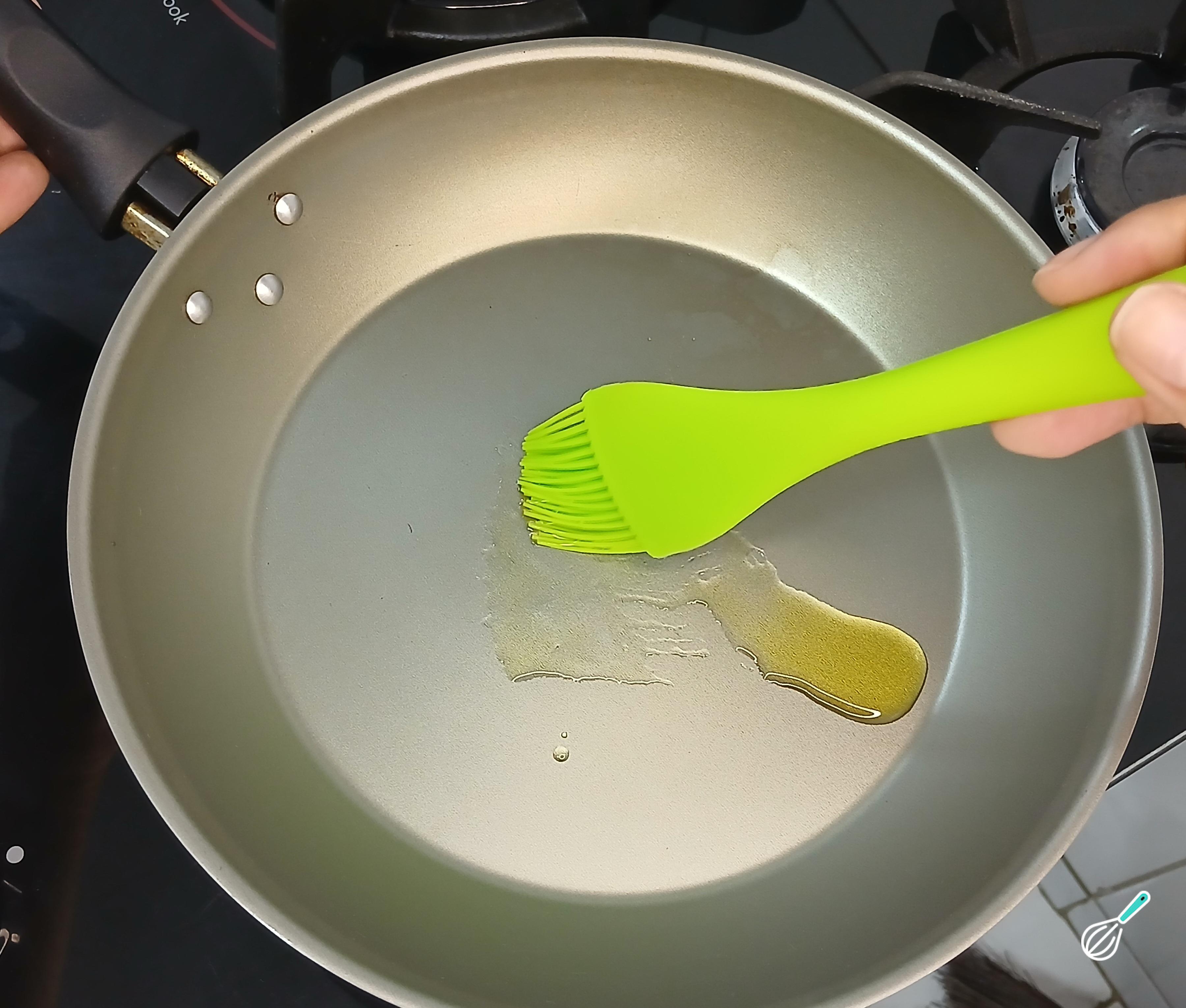 Dica: Na falta de um pincel culinário, use uma folha de papel toalha para espalhar o azeite na frigideira.
