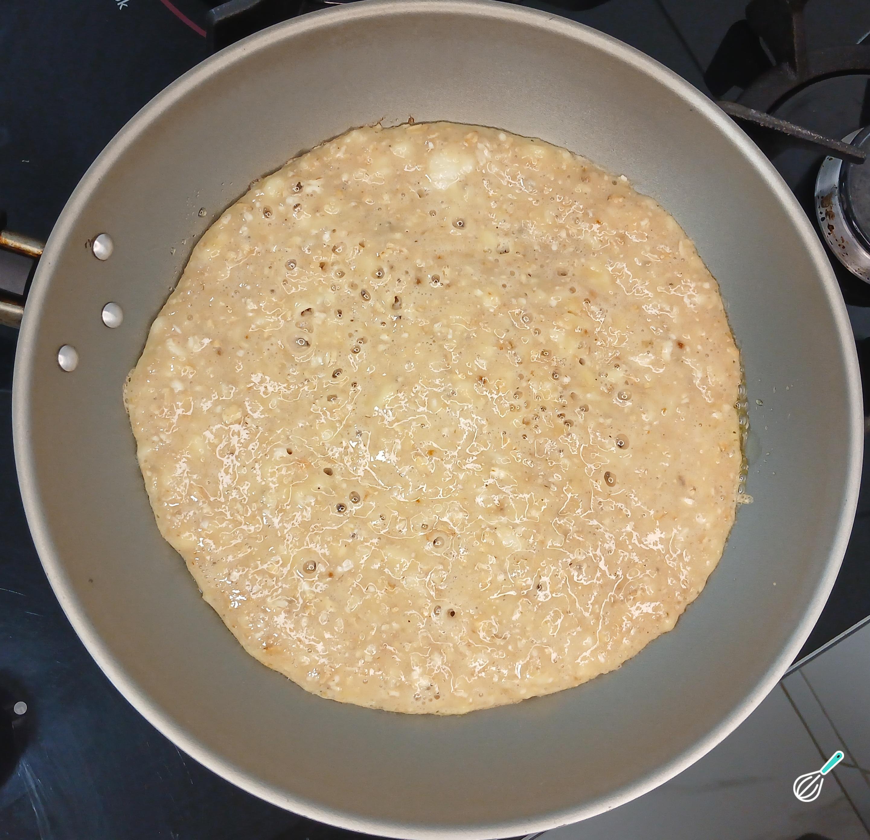 Após untar a frigideira, ligue o fogo e mantenha-o baixo. Coloque todo o conteúdo do bowl e espalhe na frigideira com a ajuda de um garfo ou colher.