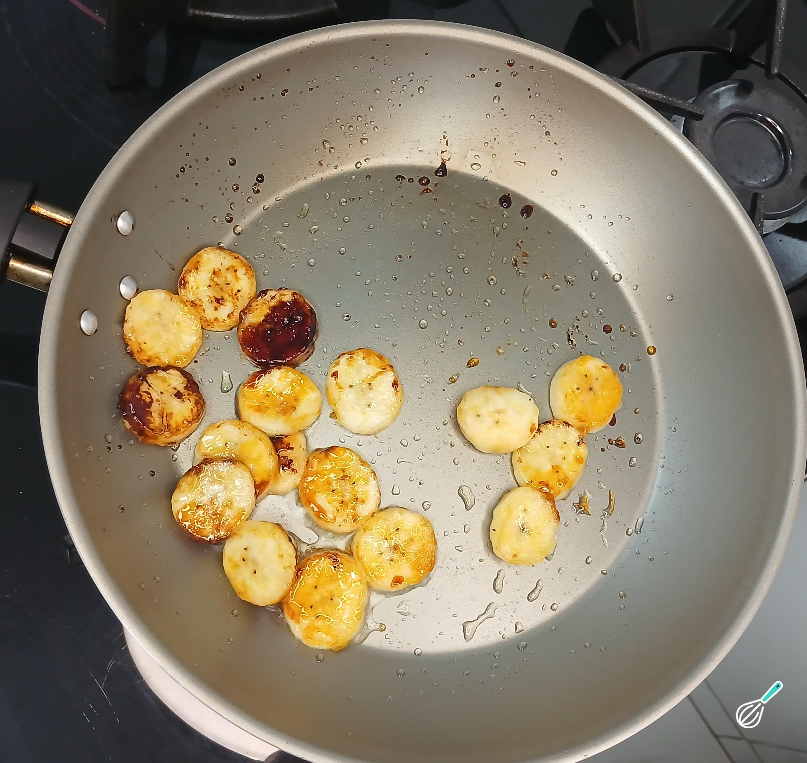 Corte em rodelas uma ou duas bananas. Na mesma frigideira usada para o preparo da aveioca, coloque as rodelas de banana para dourar.