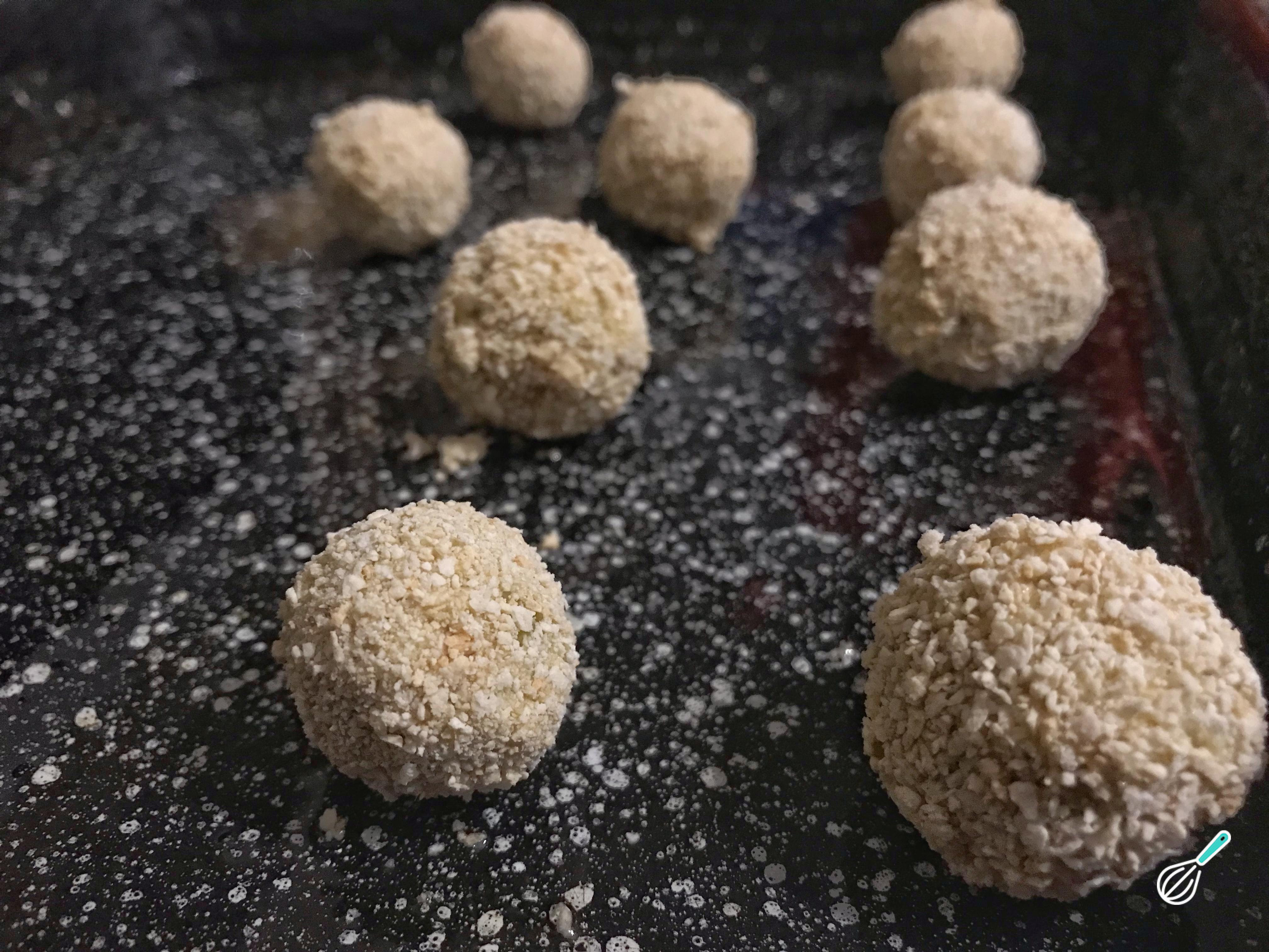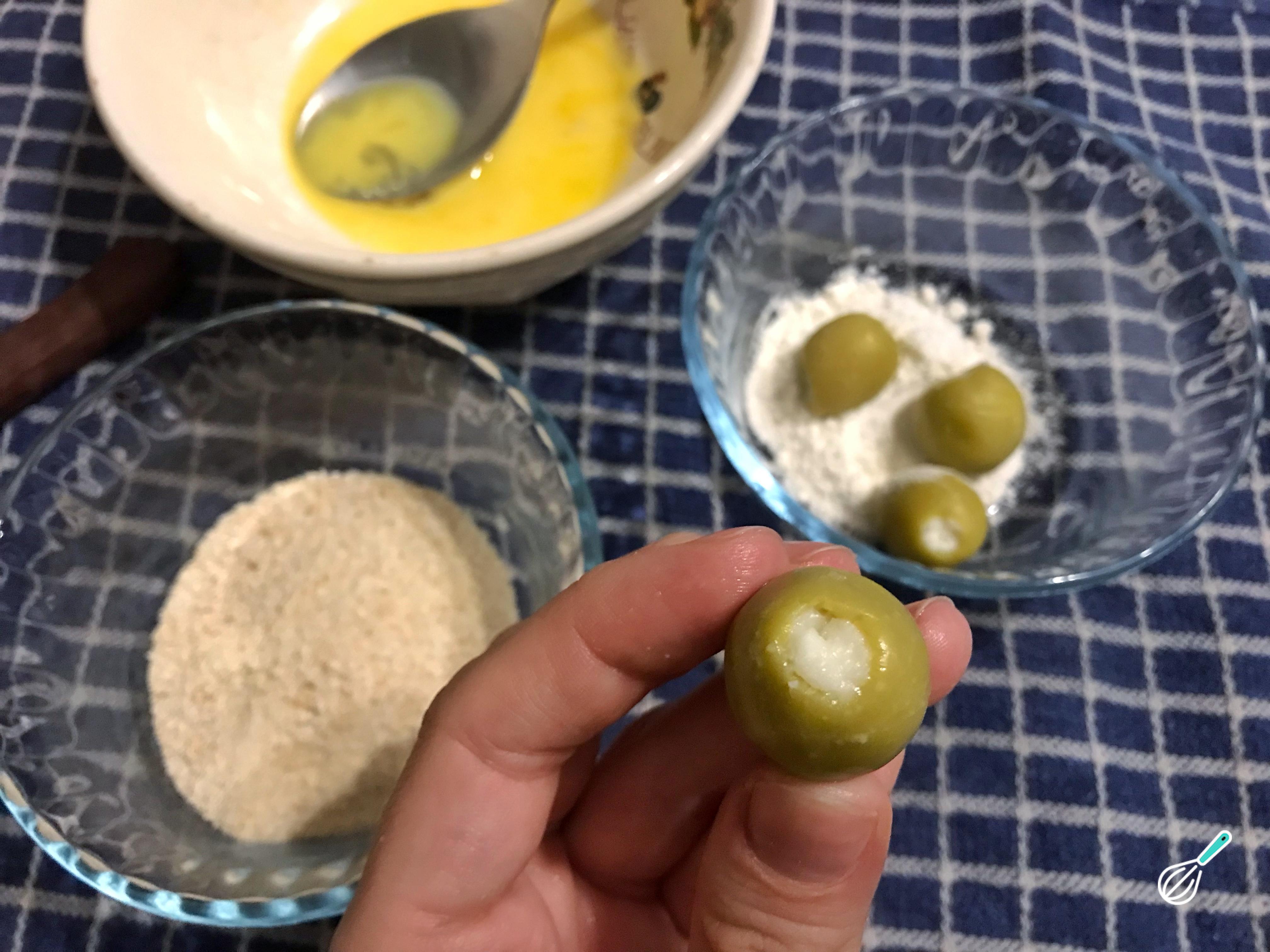 Dica: É importante a etapa da farinha de trigo, pois ela absorve a umidade das azeitonas e permite que o ovo e a farinha de rosca grudem.
